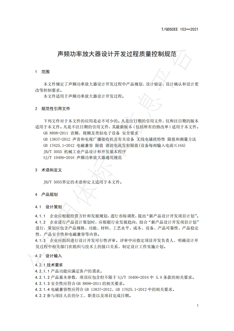 声频功率放大器设计开发过程质量控制规范Processandqualitycontrolfordesignanddevelopmentofaudiopoweramplifier348072@abc10天前发布关注私信0.23MB7页020声频功率放大器设计开发过程质量控制规范Processandqualitycontrolfordesignanddevelopmentofaudiopoweramplifier此内容为付费资源,请付费后查看¥23¥36黄金会员免费钻石会员免费立即购买您当前未登录!建议登陆后购买,可保存购买订单付费资源 第1页 / 共7页 第2页 / 共7页 第3页 / 共7页 第4页 / 共7页 第5页 / 共7页 试读已结束,还剩2页,您可下载完整版后进行离线阅读 THE END标准规范 文本预览 ICS29.140.40TGDSCEEK73广东演艺设备行业商会团体标准T/GDSCEE 102-2021声频功率放大器设计开发过程质量控制规范Process and quality control for design and development of audio power amplifier国团2021-09-30发布2021-10-08实施广东演艺设备行业商会发布 查看更多 收起部分 喜欢就支持一下吧收藏