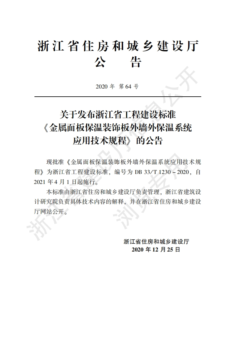 备案号:J15566-2020浙江省工程建设标准DBDB33/T1230-2020金属面板保温装饰板外墙外保温系统应用技术规程Technical specification for application of external thermal insulationsystems based on insulated decorative panel withmetal materials浙江省建浏览专2020-12-25发布2021-04-01施行浙江省住房和城乡建设厅发布
