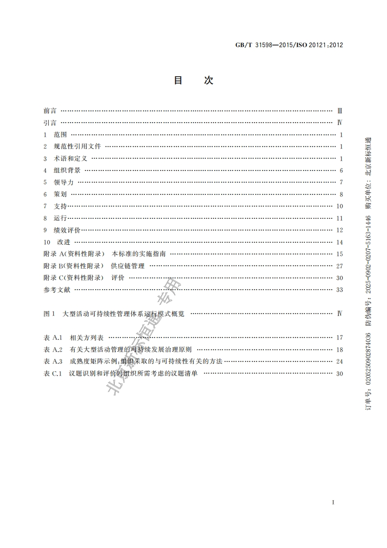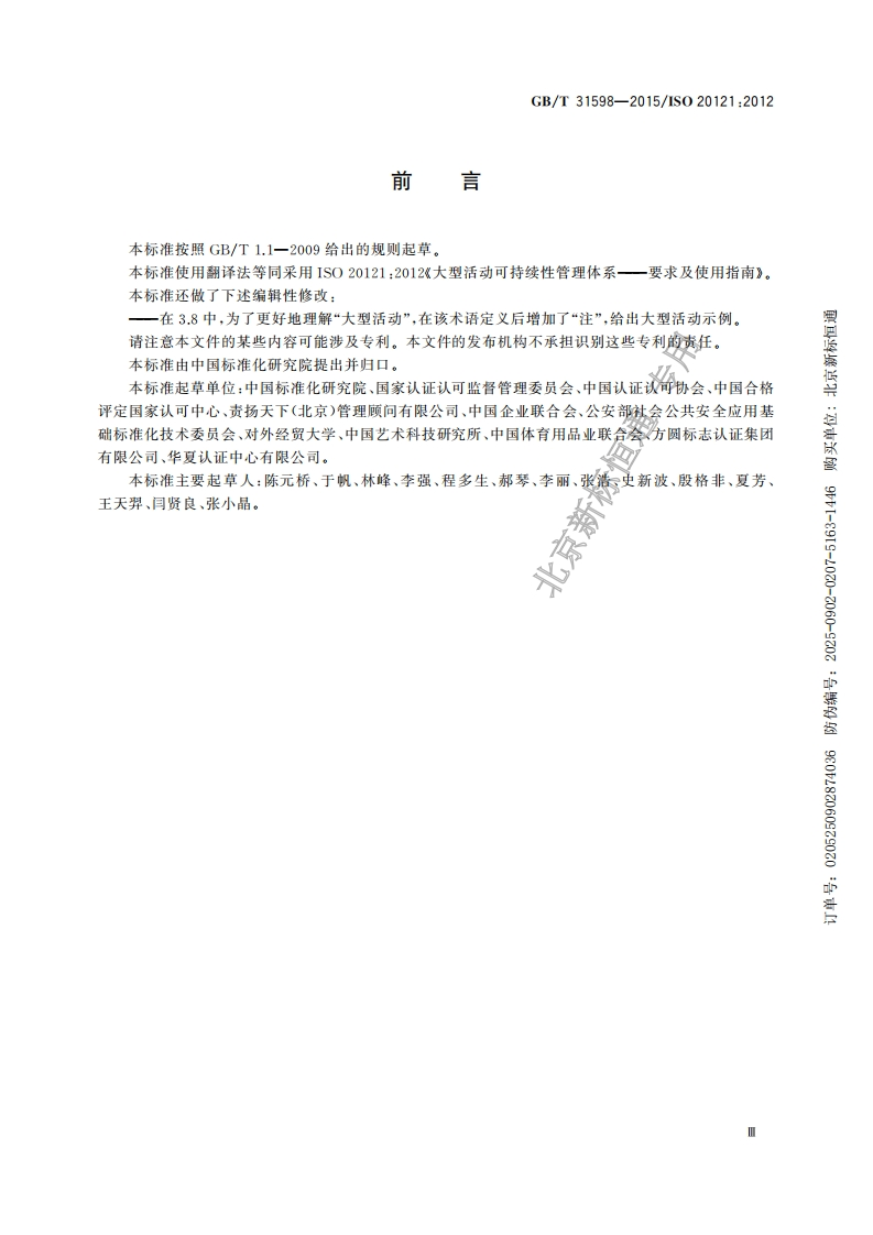 1CS03.100.01A02中华人民共和国国家标准GB/T31598一2015/IS020121:2012大型活动可持续性管理体系要求及使用指南Event sustainability management systems-Requirements with guidance for use(IS020121:2012,DT)2015-06-02发布2016-01-01实施中华人民共和国国家质量监督检验检疫总局发布中国国家标准化管理委员会