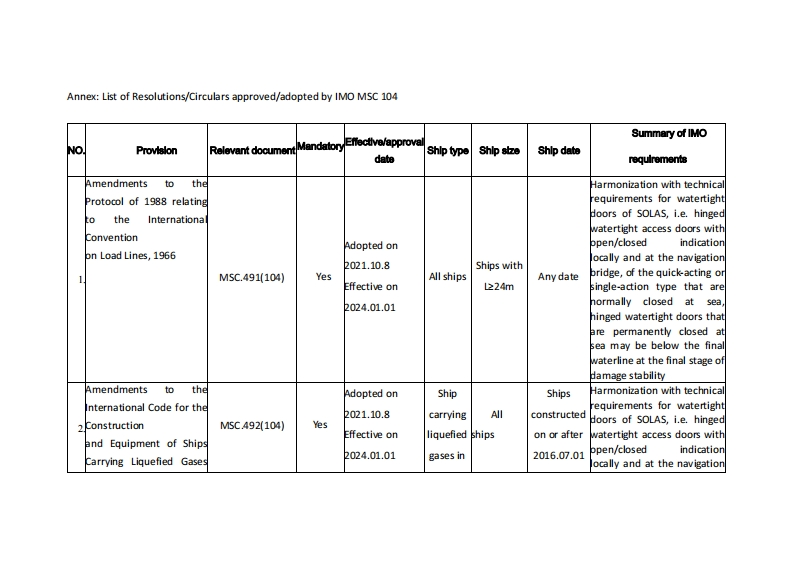CCSTechnical Information(2022)Technical Information No.10 Total No.582/Rev.1May.26,2022(Total 4 pages)To:Relevant shipowners,ship management companies,shipyards and designers,productmanufacturer,related departments of the Headquarters of CCS,the Society's surveyors,Plan Approval CentersTechnical Notice on Resolutions/Circulars by Adopted/Approved onIMO MSC 104The Maritime Safety Committee of the International Maritime Organization,at its104th session,adopted 4 MSC resolutions,including Amendments to the Protocol of1988 relating to the International Convention on Load Lines,1966 (MSC.491(104)),Amendments to the International Code for the Construction and Equipment of ShipsCarrying Liquefied Gases in Bulk(MSC.492(104)),Amendments to the Performancestandards for shipborne simplified voyage data recorders (S-VDRs)(resolutionMSC.163(78),as amended)(MSC.493(104)),and Amendments to the Performancestandards for shipborne voyage data recorders (VDRs)(resolutionMSC.333(90))(MSC.494(104));10 MSC circulars were also approved,includingGuidelines for Shore-Based Maintenance of Emergency Position-Indicating RadioBeacons (EPIRBs)(MSC.1/Circ.1039/Rev.1),Guidelines on Annual Testing ofEmergency Position-Indicating Radio Beacons(EPIRBs)(MSC.1/Circ.1040/Rev.2)etc.For summary,please refer to the attached List of Resolutions/Circularsapproved/adopted by IMO MSC 104.The original English and Chinese translations(Incase of doubt,the English original shall prevail)of the resolutions/circularsadopted/approved at this meeting can be successively consulted at TechnicalService/IMO&IACS Information on the CCS website (www.ccs.org.cn).This Notice is made public on CCS website (www.ccs.org.cn)and is to be distributedto the shipowners,ship management companies,shipyards and marine productmanufacturers by CCS branches within their responsible areas.In case of any doubt,please contact Technology and Information Department of CCS Headquarters(ti@ccs.org.cn).Annex:List of Resolutions/Circulars approved/adopted by IMO MSC 104