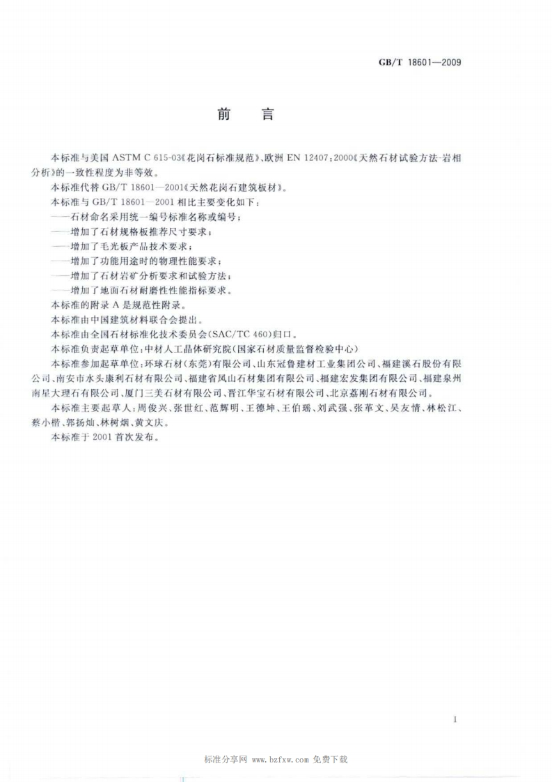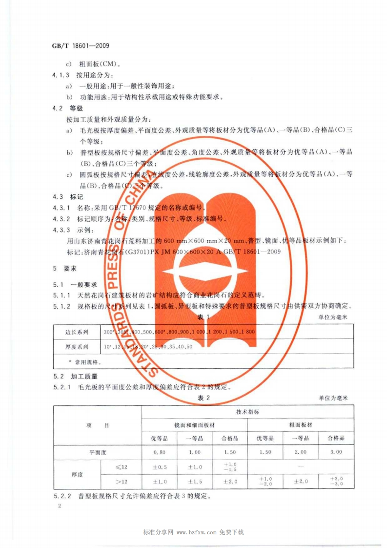 天然花岗石建筑板材Naturalgraniteforbuildingslab348072@abc9天前发布关注私信1.56MB14页042天然花岗石建筑板材Naturalgraniteforbuildingslab此内容为付费资源,请付费后查看¥23¥36黄金会员免费钻石会员免费立即购买您当前未登录!建议登陆后购买,可保存购买订单付费资源 第1页 / 共14页 第2页 / 共14页 第3页 / 共14页 第4页 / 共14页 第5页 / 共14页 试读已结束,还剩9页,您可下载完整版后进行离线阅读 THE END标准规范 文本预览 1Cs91.100.30Q21GB中华人民共和国国家标准GB/T18601-2009代替GB/T18601一2001天然花岗石建筑板材Natural granite for building slab2009-03-28发布2010-01-01实施中华人民共和国国家质量监督检验检疫总局数码防伪中国国家标准化管理委员会发布 查看更多 收起部分 喜欢就支持一下吧收藏