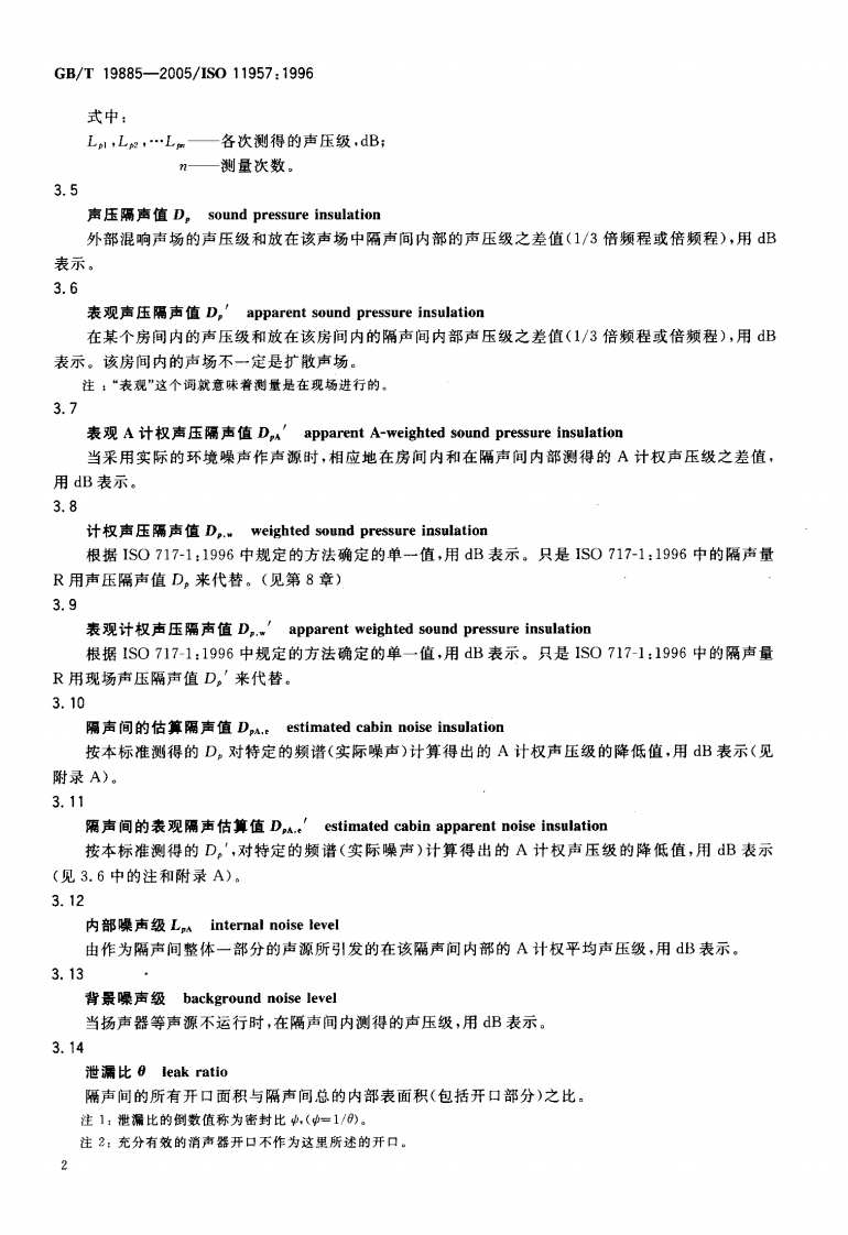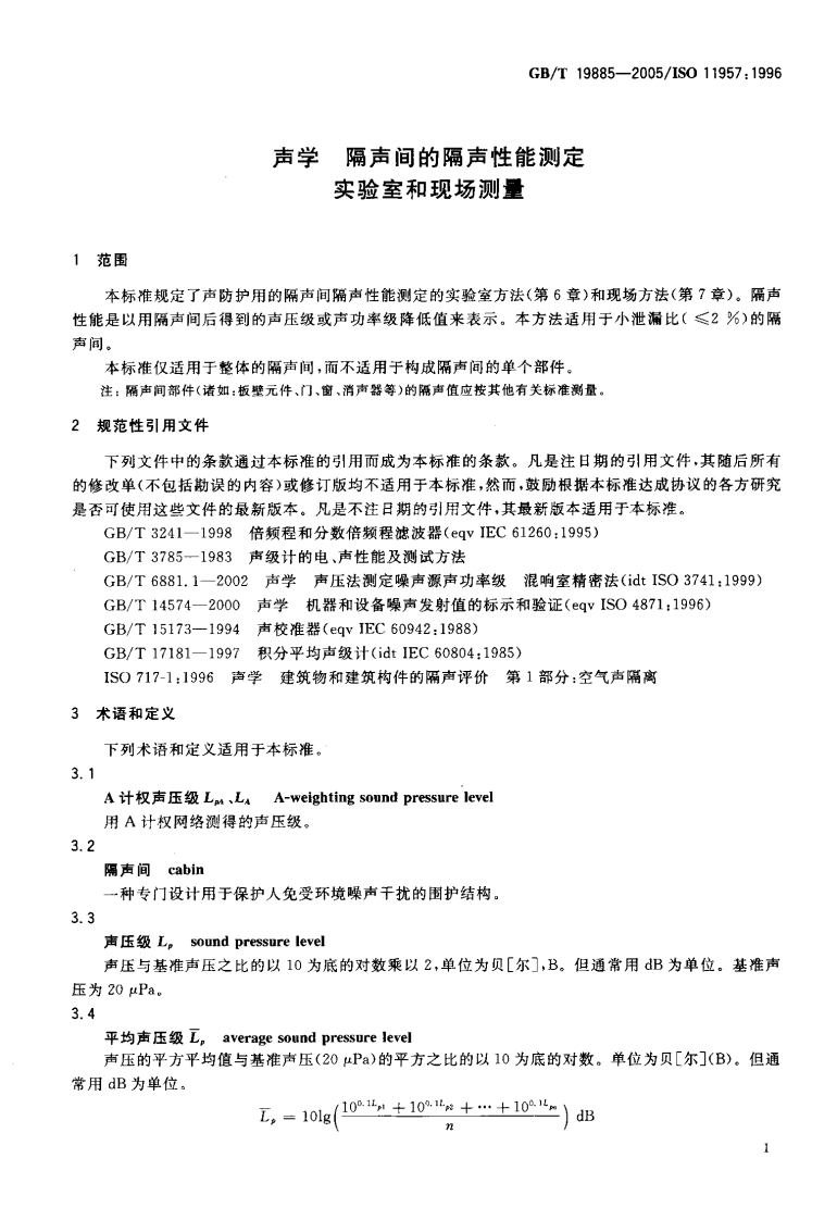 ICS17.140.01Z32中华人民共和国国家标准GB/T19885一2005/1S011957:1996声学隔声间的隔声性能测定实验室和现场测量Acoustics-Determination of sound insulation performance of cabins-Laboratory and in-situ measurements(ISO11957:1996,IDT)2005-09-09发布2006-04-01实施中华人民共和国国家质量监督检验检疫总局中国国家标准化管理委员会发布