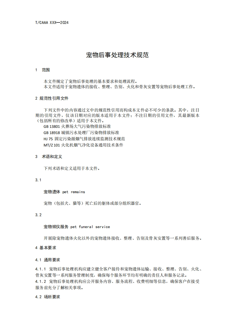 宠物后事处理技术规范TechnicalsSpecificationsforHandlingPetAfterlifeMatters348072@abc8天前发布关注私信0.64MB11页040宠物后事处理技术规范TechnicalsSpecificationsforHandlingPetAfterlifeMatters此内容为付费资源,请付费后查看¥23¥36黄金会员免费钻石会员免费立即购买您当前未登录!建议登陆后购买,可保存购买订单付费资源 第1页 / 共11页 第2页 / 共11页 第3页 / 共11页 第4页 / 共11页 第5页 / 共11页 试读已结束,还剩6页,您可下载完整版后进行离线阅读 THE END标准规范 文本预览 1CS点击此处添加ICS号B点击此处添加B号团体标准T/CAAA XXX-2025宠物后事处理技术规范Technical Specifications for Handling Pet Afterlife Matters(征求意见稿)2025-Xx-Xx发布2025-Xx-XX实施中国畜牧业协会发布 查看更多 收起部分 喜欢就支持一下吧收藏
