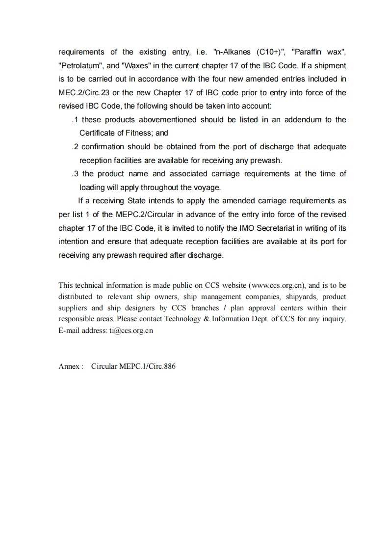 Form:RWPRR401-HCCS技术通告Technical Information(2020)Technical notice No.39/Total No.47312/06/2020(Total pages:2+4)To:CCS'relevant departments of the headquarters,CCS surveyors,plan approval centers,relevant shipowners,shipyards,product manufacturers and designersTechnical Notice on the Guidance on the Implementation of ProvisionalCategorization of Liquid Substances Related to Paraffin-Like Products(MEPC.1/Cire.886)by IMO1.BackgroundThe Marine Environment Protection Committee,at its seventy-fourth session,approved and issued the Guidance on the implementation of provisionalcategorization of liquid substances in accordance with MARPOL Annex ll and theIBC Code elated to paraffin-like products,which is set out in the annex.2.Main Content.MEPC 71 approved the amendments to the names of four paraffin-likeproducts and their minimum carriage requirements,namely "n-Alkanes(C10-C20)","Paraffin wax,highly-refined","Paraffin wax,semi-refined",and "Hydrocarbon wax"and incorporated the amendments into list 1 of the MEPC.2/Circular 23 which wasissued and came into force in December,2017.The revised names and theirminimum carriage requirements of the four paraffin-like products have also beenincorporated into the revised Chapter 17 of IBC code (by MEPC.318(74)andMSC.460(101))and will enter into force on 1 January 2021.Though those paraffin-like products can be shipped in according to the related