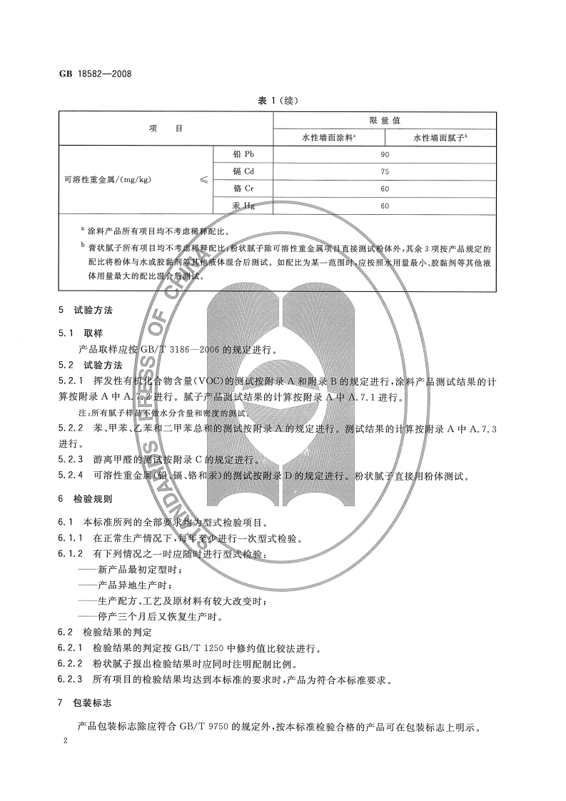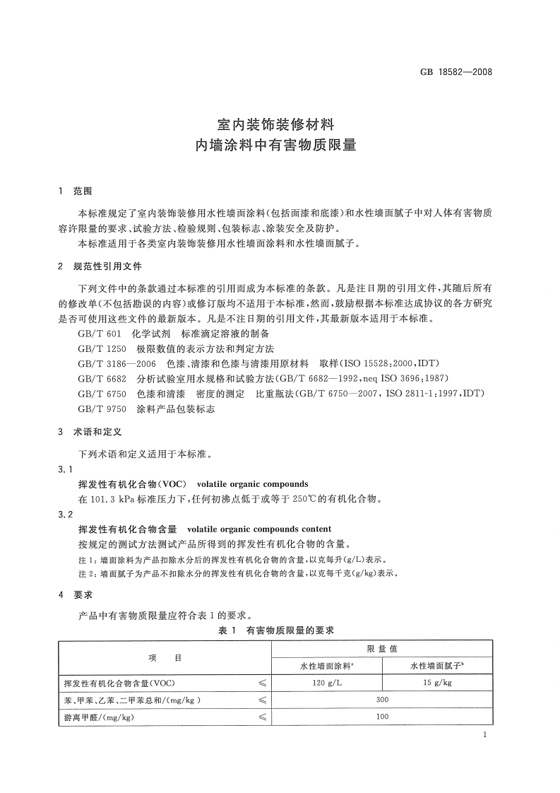 ICS87.040G51中华人民共和国国家标准GB18582-2008代替GB18582一2001室内装饰装修材料内墙涂料中有害物质限量Indoor decorating and refurbishing materials-Limit of harmful substances of interior architectural coatings2008-04-01发布2008-10-01实施中华人民共和国国家质量监督检验检疫总局中国国家标准化管理委员会发布