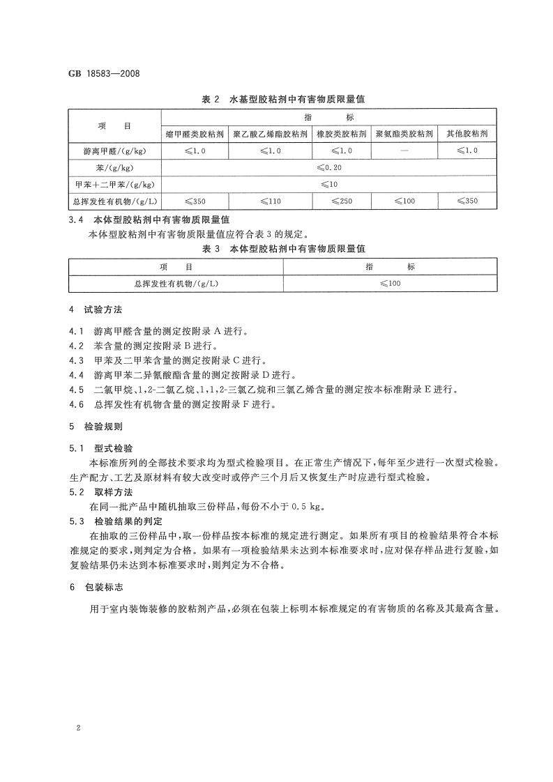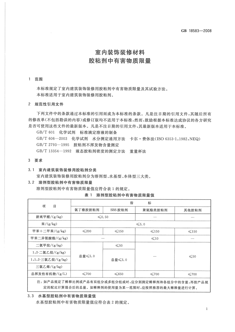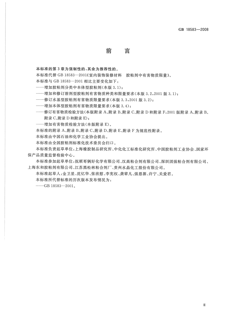 ICS83.180G38中华人民共和国国家标准GB18583—2008代替GB18583-2001室内装饰装修材料胶粘剂中有害物质限量Indoor decorating and refurbishing materials-Limit of harmful substances of adhesives2008-09-24发布2009-09-01实施中华人民共和国国家质量监督检验检疫总局中国国家标准化管理委员会发布