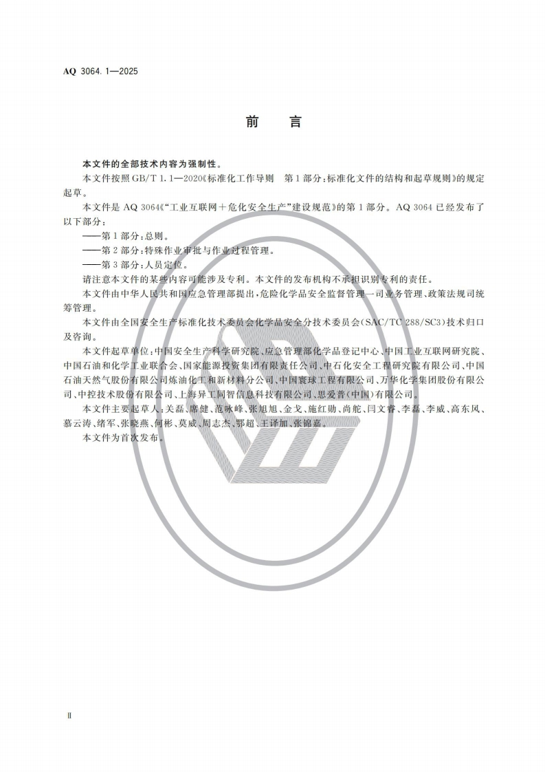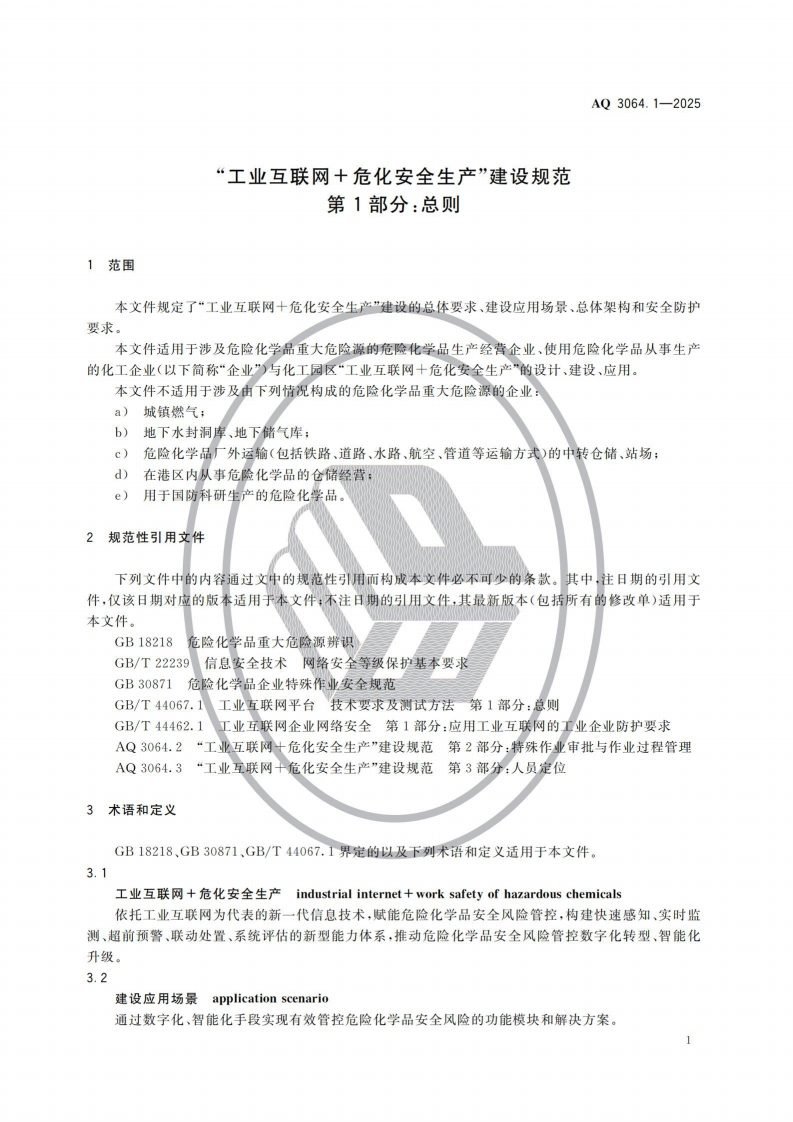 1CS35.240.50CCS G 09AQ中华人民共和国安全生产行业标准AQ3064.1-2025“工业互联网十危化安全生产”建设规范第1部分:总则Specification for"industrial internet+work safety of hazardouschemicals"-Part 1:General principles2025-12-13发布2026-07-01实施中华人民共和国应急管理部发布
