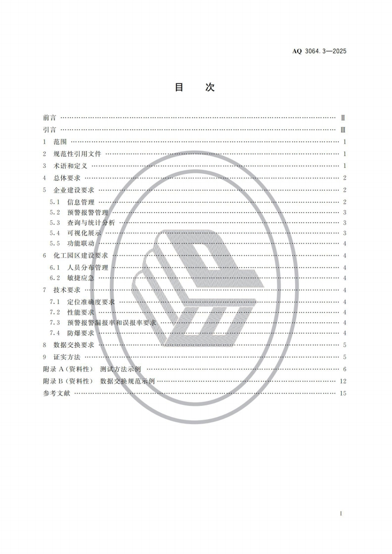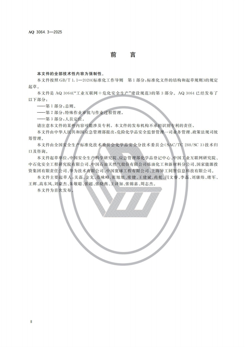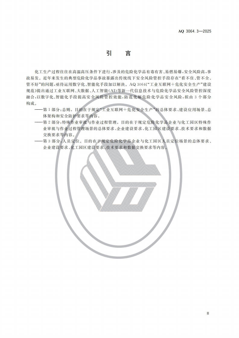 1CS35.240.50CCS G 09AQ中华人民共和国安全生产行业标准AQ3064.3-2025“工业互联网十危化安全生产”建设规范第3部分:人员定位Specification for"industrial internet+work safety of hazardouschemicals"-Part 3:Personnel positioning2025-12-13发布2026-07-01实施中华人民共和国应急管理部发布