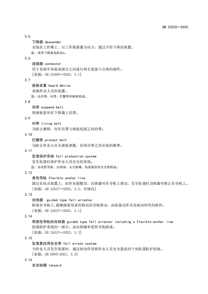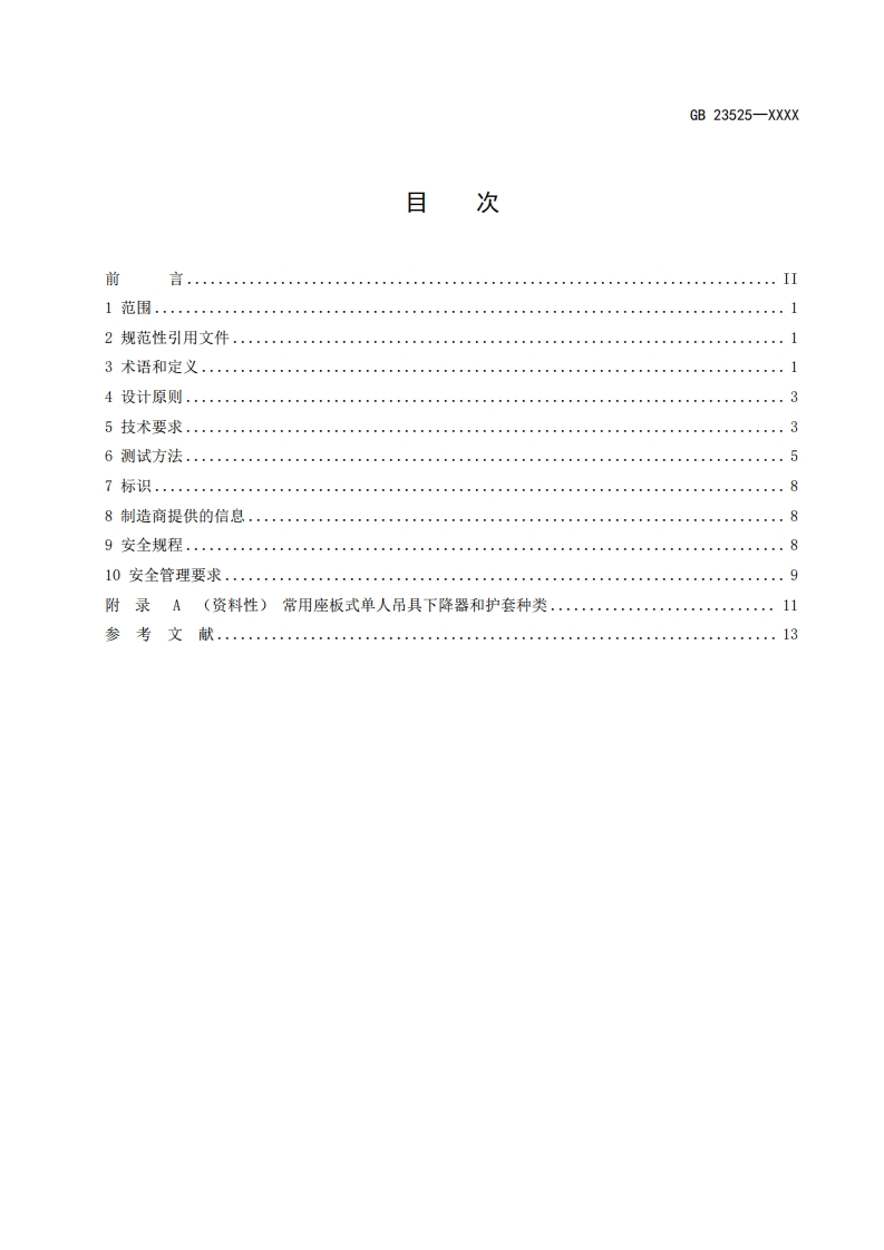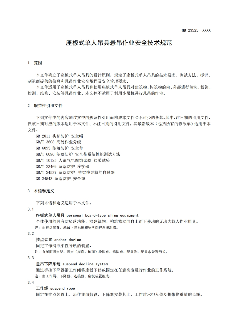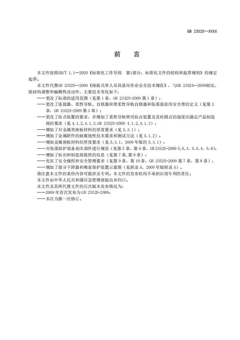 ICS13.100CCS 65GB中华人民共和国国家标准GB 23525-XXXX代替GB23525-2009座板式单人吊具悬吊作业安全技术规范Safety technical criterion for personal board-type sling equipment for suspendingwork(征求意见稿)在提交反馈意见时,请将您知道的相关专利连同支持性文件一并附上。XXXX-Xx-XX发布XXXX-Xx-XX实施国家市场监督管理总局发布国家标准化管理委员会
