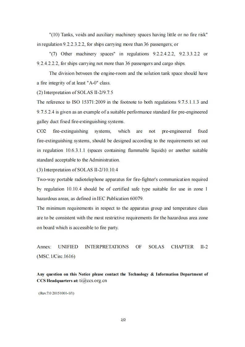 CCSTechnical Information(2020)Technical Information No.16 Total No.450Feb.05,2020(Total 2 pages)To:Ship owners,Shipyards,Products Manufacturers and Designers,Relevant departments of CCSHeadquarters,CCS site surveyors,CCS plan approval centersTechnical Notice on "UNIFIED INTERPRETATIONS OF SOLASCHAPTERⅡ-2”MSC.1/Circ.1616Issued by IMOI Foreword1.1 The Maritime Safety Committee of International Maritime Organization,at its101th session(5 to 14 June 2019),approved "UNIFIED INTERPRETATIONS OFSOLAS CHAPTER II-2"(MSC.1/Circ.1616).1.2 The circular applies to all passenger ships and cargos ships with GT>500constructed on or after 26 June 2019.II.Technical points2.1 Main contents(1)Interpretation of SOLAS II-2/9.2In cases where urea or sodium hydroxide solution tanks for selective catalyticreduction (SCR)systems,exhaust gas recirculation (EGR)systems or exhaust gascleaning systems (EGCS)are installed in a space separated from the engine-room,indetermining fire integrity of divisions,the solution tank space should be considered as"similar spaces"in the definition of"machinery spaces"in regulation 3.30 and shouldbe categorized as: