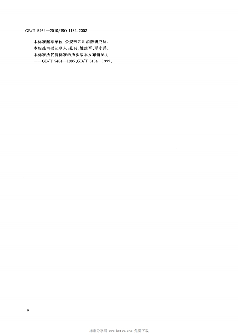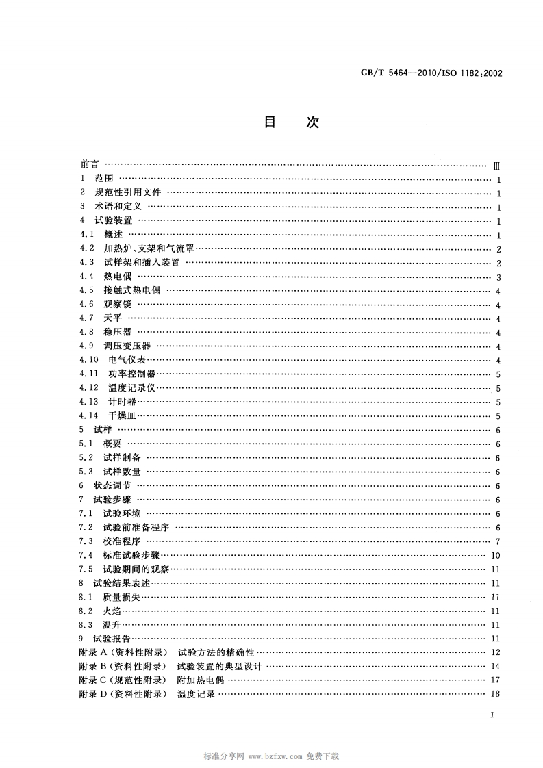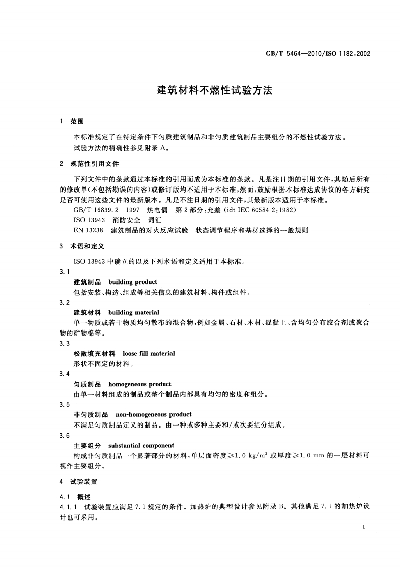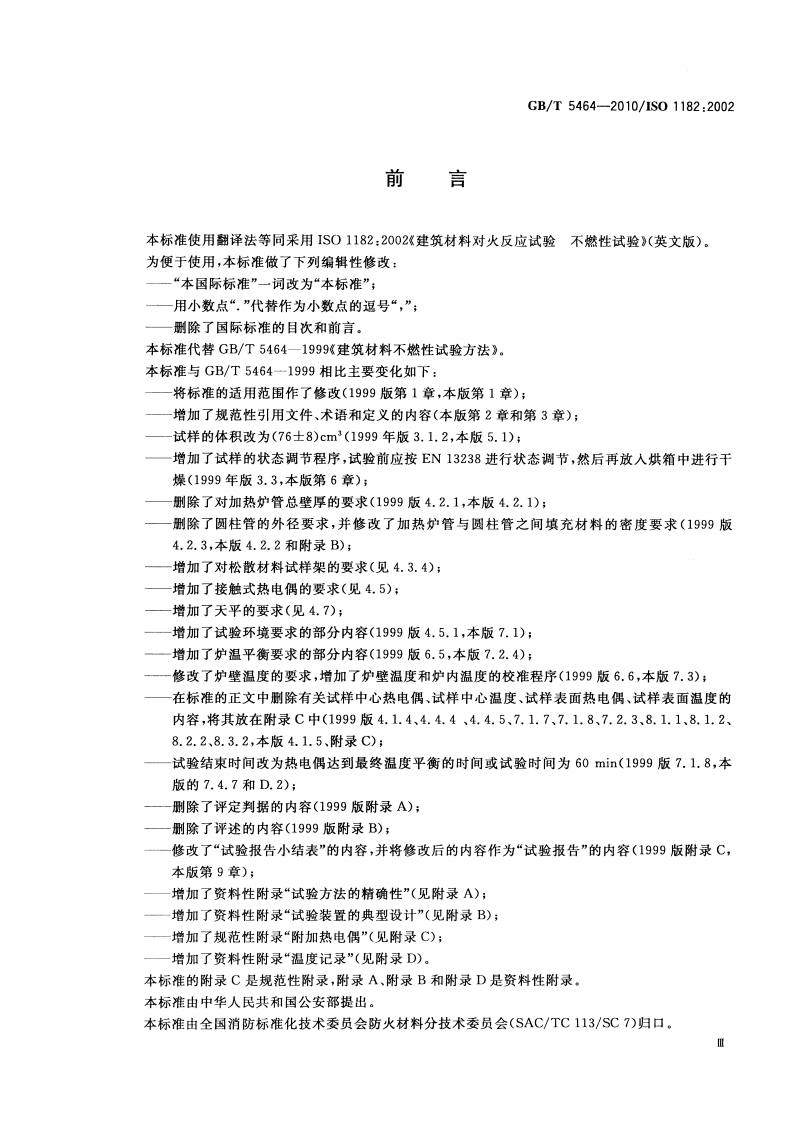 1CS13.220.50C82中华人民共和国国家标准GB/T5464-2010/IS01182:2002代替GB/T5464一1999建筑材料不燃性试验方法Non-combustibility test method for building materials(ISO 1182:2002,Reaction to fire tests for building products-Non-combustibility test,IDT)2010-09-26发布2011-02-01实施中华人民共和国国家质量监督检验检疫总局中国国家标准化管理委员会发布