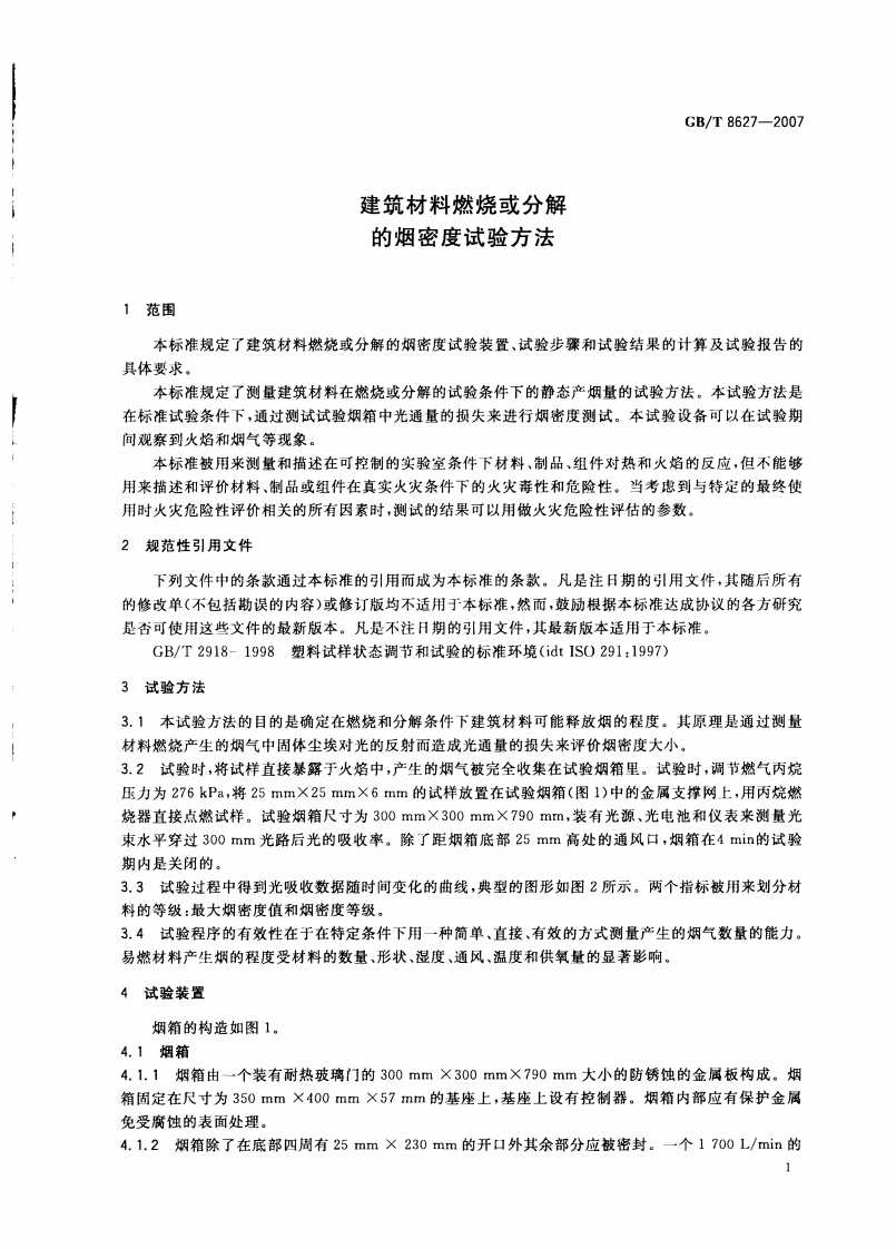 1CS13.220.50Q10GB中华人民共和国国家标准GB/T8627-2007代替GB/T8627一1999建筑材料燃烧或分解的烟密度试验方法Test method for density of smoke from the burningor decomposition of building materials2007-12-21发布2008-06-01实施中华人民共和国国家质量监督检验检疫总局发布中国国家标准化管理委员会