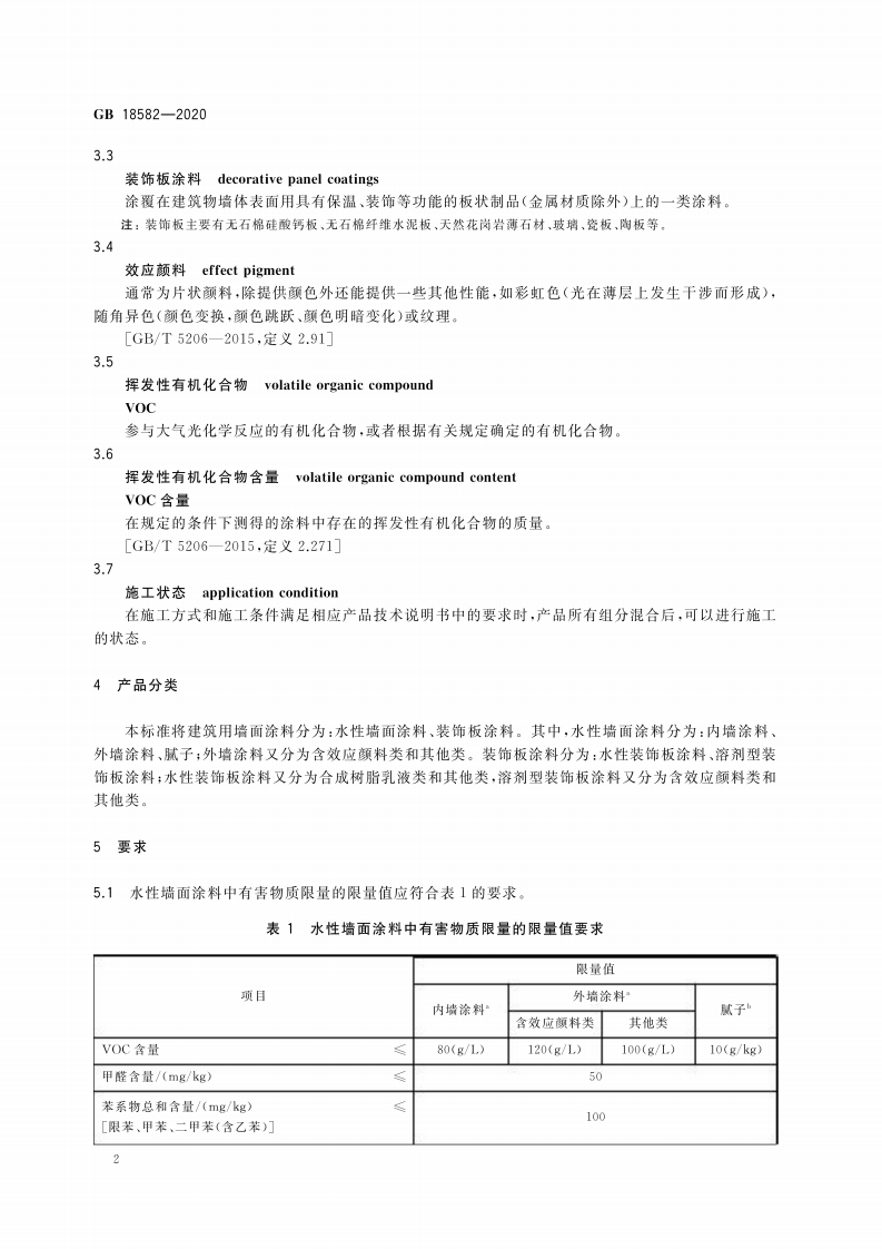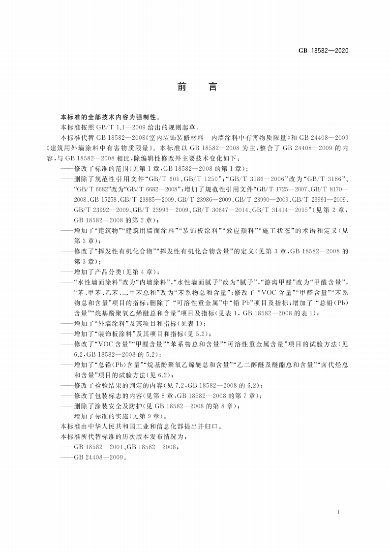 ICS87.040G51GB中华人民共和国国家标准GB18582—2020代替GB18582-2008,GB24408-2009建筑用墙面涂料中有害物质限量Limit of harmful substances of architectural wall coatings2020-03-04发布2020-12-01实施国家市场监督管理总局国家标准化管理委员会发布
