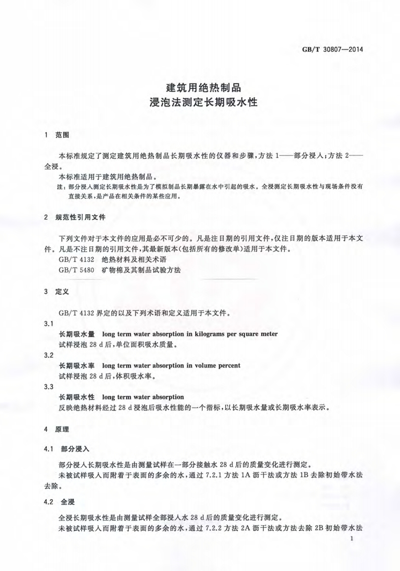 ICs91.120.10Q25中华人民共和国国家标准GB/T30807-2014建筑用绝热制品浸泡法测定长期吸水性Thermal insulating products for building applications-Determination of long-term water absorption by immersion2014-05-06发布2015-02-01实施中华人民共和国国家质量监督检验检疫总局发布Φ3中国国家标准化管理委员会