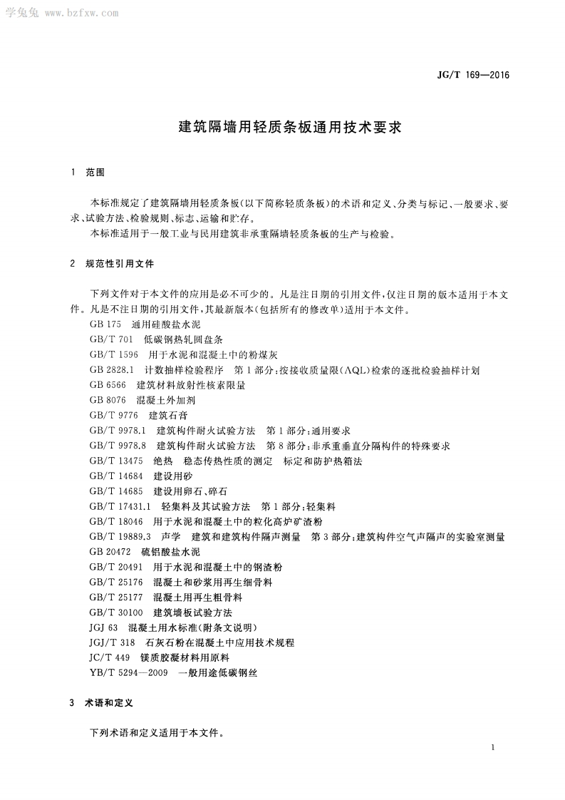 建筑隔墙用轻质条板通用技术要求Generaltechnicalrequirementsoflightweightpanelusedforbuildingpartition348072@abc6天前发布关注私信1.39MB20页033建筑隔墙用轻质条板通用技术要求Generaltechnicalrequirementsoflightweightpanelusedforbuildingpartition此内容为付费资源,请付费后查看¥23¥36黄金会员免费钻石会员免费立即购买您当前未登录!建议登陆后购买,可保存购买订单付费资源 第1页 / 共20页 第2页 / 共20页 第3页 / 共20页 第4页 / 共20页 第5页 / 共20页 试读已结束,还剩15页,您可下载完整版后进行离线阅读 THE END标准规范 文本预览 1Cs91.060.10Q15G中华人民共和国建筑工业行业标准JG/T169-2016代替JG/T169-2005建筑隔墙用轻质条板通用技术要求General technical requirements of light weight panel used for building partition2016-09-06发布2017-03-01实施中华人民共和国住房和城乡建设部发布 查看更多 收起部分 喜欢就支持一下吧收藏