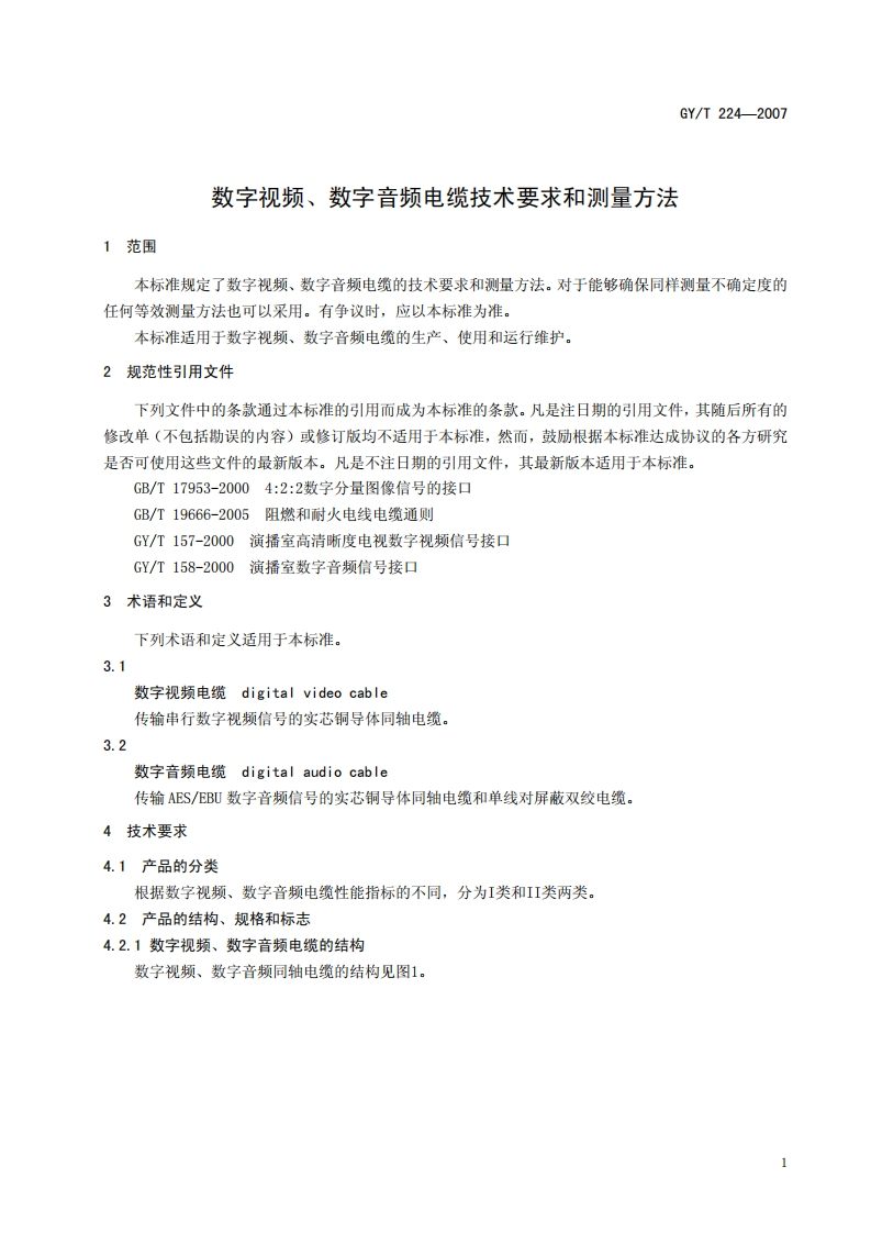 数字视频、数字音频电缆技术要求和测量方法Specificationsandmethodsofmeasurementfordigitalvideocableanddigitalaudiocable348072@abc7天前发布关注私信0.65MB20页022数字视频、数字音频电缆技术要求和测量方法Specificationsandmethodsofmeasurementfordigitalvideocableanddigitalaudiocable此内容为付费资源,请付费后查看¥23¥36黄金会员免费钻石会员免费立即购买您当前未登录!建议登陆后购买,可保存购买订单付费资源 第1页 / 共20页 第2页 / 共20页 第3页 / 共20页 第4页 / 共20页 第5页 / 共20页 试读已结束,还剩15页,您可下载完整版后进行离线阅读 THE END标准规范 文本预览 GY中华人民共和国广播电影电视行业标准GY/T224-2007数字视频、数字音频电缆技术要求和测量方法Specifications and methods of measurementfor digital video cable and digital audio cable2007-02-17发布2007-04-01实施国家广播电影电视总局发布 查看更多 收起部分 喜欢就支持一下吧收藏