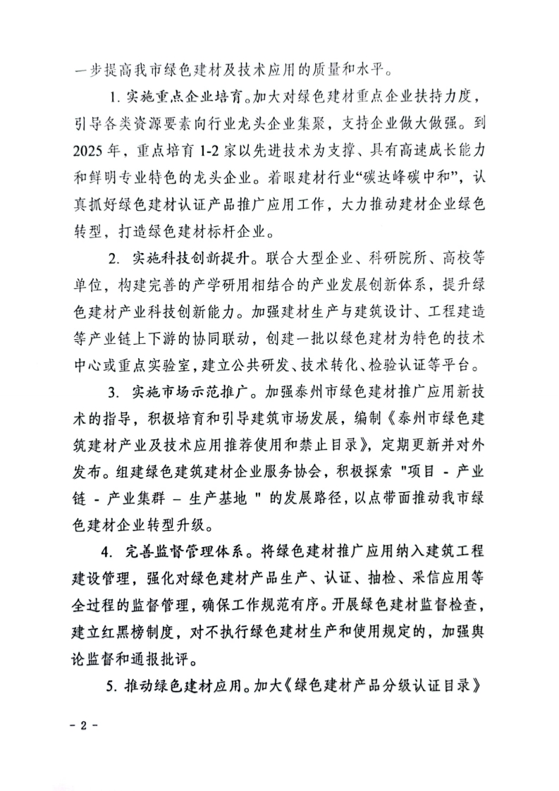泰州市皖城乡建设局文件泰建发〔2022〕199号泰州市住房和城乡建设局关于印发《关于进一步加强我市绿色建材生产及推广应用的实施意见》的通知各有关单位:为加强我市绿色建材生产及应用,促进我市建筑品质提升,推动建筑行业绿色化发展,根据《建设领域推广应用新技术管理规定》(建设部令109号)、《江苏省绿色建筑发展条例》、《江苏省建设领域推广应用新技术管理实施细则》、《省住房和城乡建设厅关于发布江苏省建设领域“十四五”重点推广应用新技术的公告》(〔2022〕第3号)入、《江苏省新型墙体材料产品认定管理办法》(苏工信工〔2022〕1号),结合我市实际制定本实施意见。一、主要任务坚持政府引导与市场推动相结合,通过重点企业培育、科技创新、市场示范推广、监督管理、绿色建材产品认证等机制,进-1-
