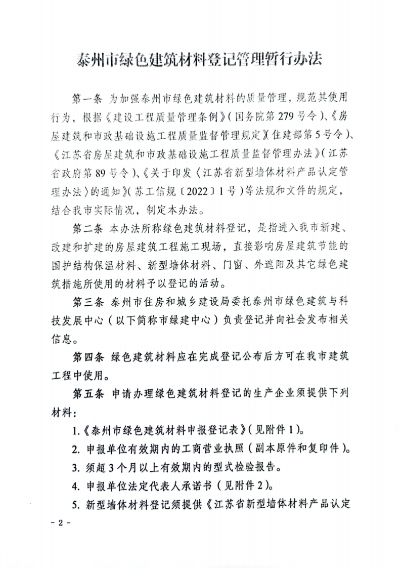 TJF2022-200348072@abc2个月前发布关注私信1.41MB6页0249TJF2022-200此内容为付费资源,请付费后查看¥13¥23黄金会员免费钻石会员免费立即购买您当前未登录!建议登陆后购买,可保存购买订单付费资源 第1页 / 共6页 第2页 / 共6页 试读已结束,还剩4页,您可下载完整版后进行离线阅读 © 版权声明文章版权归作者所有,未经允许请勿转载。THE END标准规范 文本预览 泰市房和城乡建设局文件泰建发〔2022〕200号泰州市住房和城乡建设局关于印发《泰州市绿色建筑材料登记管理暂行办法》的通知各有关单位:为加强对泰州市绿色建筑材料的质量管理,规范其使用行为,根据相关法规和文件规定,结合泰州市实际情况,我局制定了《泰州市绿色建筑材料登记管理暂行办法》,现印发给你们,请遵照执行。和而泰州地凝房和城猪设局2022年9月8分1 查看更多 收起部分 喜欢就支持一下吧点赞9 分享QQ空间微博QQ好友海报分享复制链接收藏