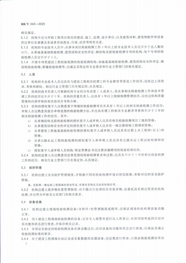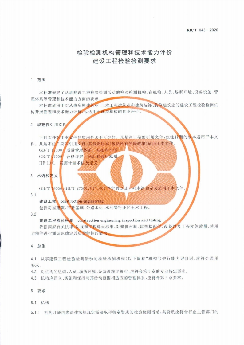 ICS03.120.20A00RB中华人民共和国认证认可行业标准RB/T043-2020检验检测机构管理和技术能力评价建设工程检验检测要求Competence assessment of management and technical for inspection body andlaboratory-Requirements for construction engineering inspection and testing2020-08-26发布2020-12-01实施国家认证认可监督管理委员会发布Φ