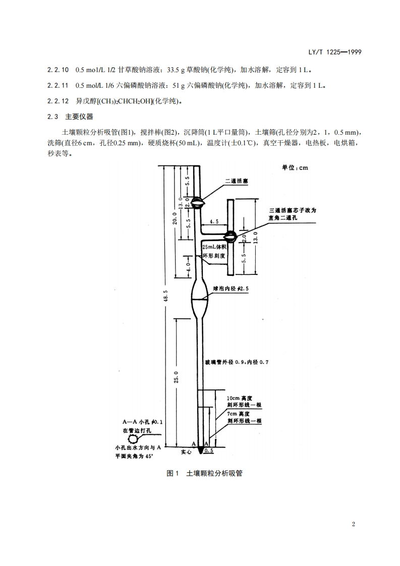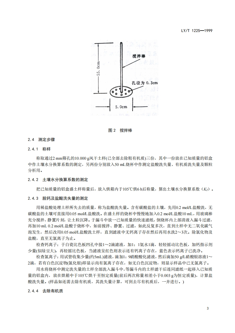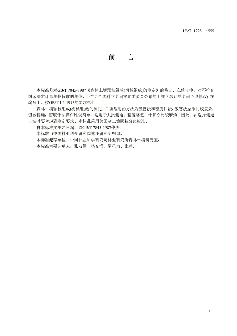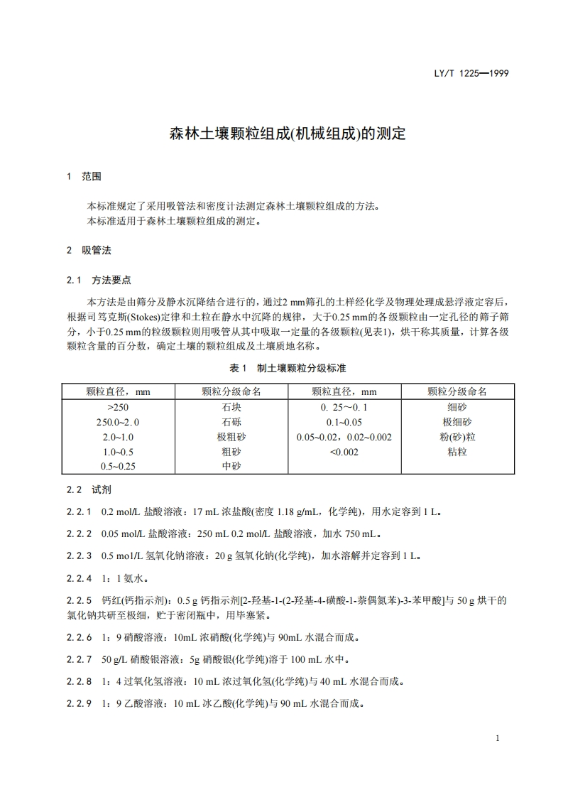 森林土壤颗粒组成(机械组成)的测定Determinationofforestsoilparticle-sizecomposition(mechanicalcomposition)348072@abc7天前发布关注私信2.11MB14页025森林土壤颗粒组成(机械组成)的测定Determinationofforestsoilparticle-sizecomposition(mechanicalcomposition)此内容为付费资源,请付费后查看¥23¥36黄金会员免费钻石会员免费立即购买您当前未登录!建议登陆后购买,可保存购买订单付费资源 第1页 / 共14页 第2页 / 共14页 第3页 / 共14页 第4页 / 共14页 第5页 / 共14页 试读已结束,还剩9页,您可下载完整版后进行离线阅读 THE END标准规范 文本预览 ICSB10Y中华人民共和国林业行业标准LYT1225-1999森林土壤颗粒组成(机械组成)的测定Determination of forest soil particle-size composition(mechanical composition)1999-07-15发布1999-11-01实施国家林业局发布 查看更多 收起部分 喜欢就支持一下吧收藏