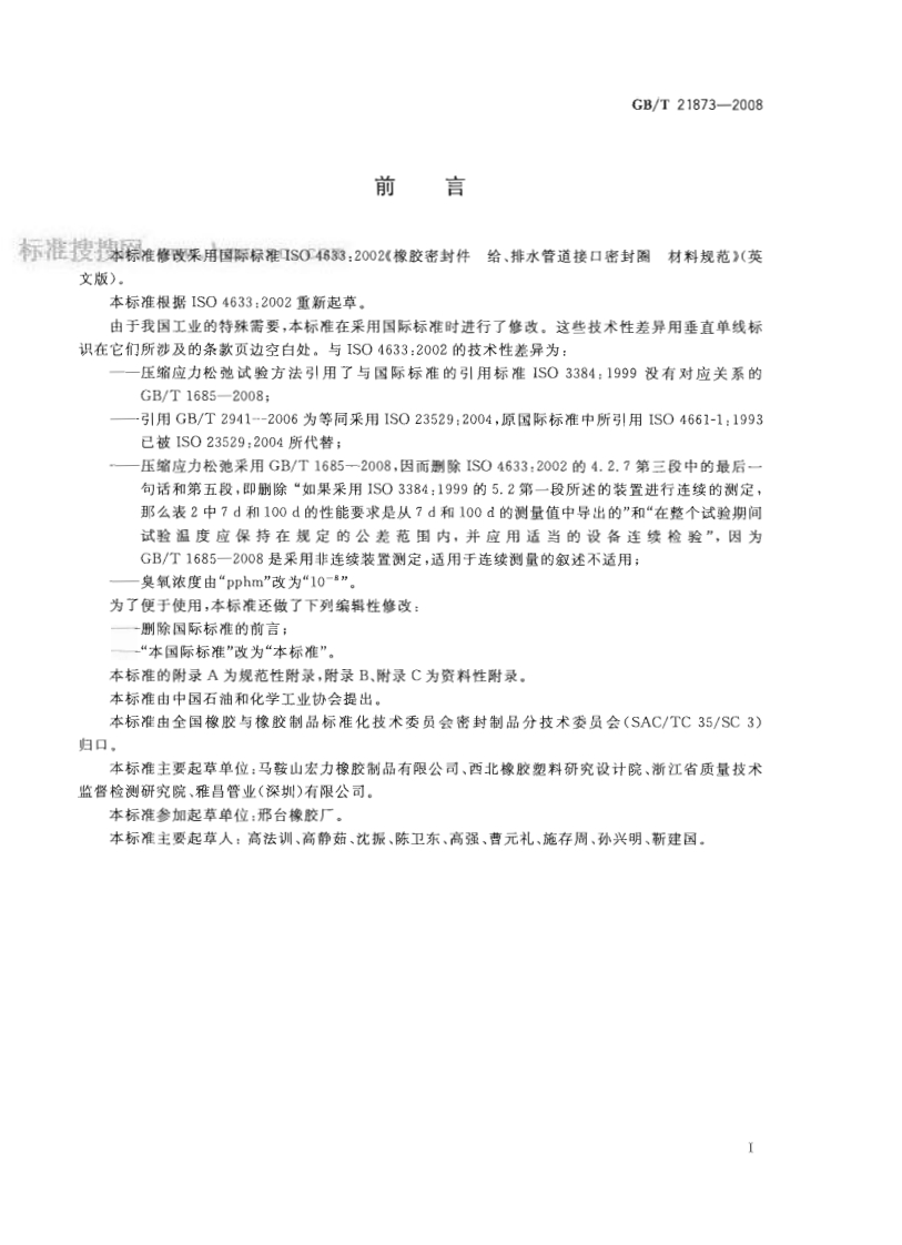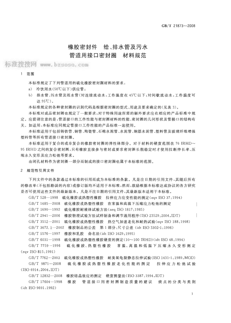 1CS83.140.50:91.140.60:91.140.80G43中华人民共和国国家标准标准搜搜网W.bzs0s0.comGB/T21873—2008橡胶密封件:给、排水管及污水管道用接口密封圈材料规范Rubber seals-Joint rings for water supply,drainage andsewerage pipelines-Specification for materials(ISO4633:2002,MOD)资料专用章2008-05-14发布2008-10-01实施中华人民共和国国家质量监督检验检疫总局发布中国国家标准化管理委员会数码防伪