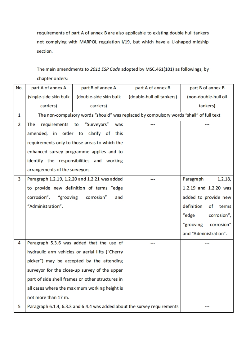 CCSTechnical Information(2020)Technical Information No.42 Total No.476Jun.19,2020(Total 6 pages Attachment)To:Shipowners,Shipping companies,Thickness measurement companies approved by CCS,AllCCS branch offices,CCS surveyorsTechnical notice on the implementation of the ResolutionMSC.461(101)---Amendments to the International Code on theEnhanced Programme of Inspections during Surveys of Bulk Carriersand Oil Tankers,2011(2011 ESP Code)The Marine Safety Committee (MSC)of International Maritime Organization (IMO),at its hundred and first session (MSC 101)on June 05-14,2019 adopt theAmendments to the International Code on the Enhanced Programme of Inspectionsduring Surveys of Bulk Carriers and Oil Tankers,2011 (2011 ESP Code)byMSC.461(101).This amendments includes new requirements of IACS UR Z10s series,textual amend and supplement to the International Code on the EnhancedProgramme of Inspections during Surveys of Bulk Carriers and Oil Tankers,2011(2011 ESP Code)adopted by the Resolution A.1049(27),consistent with therequirements of IACS UR Z10s series.Resolution MSC.461(101)will come into forceon 1 Jan,2021.The 2011 ESP Code has been developed to provide a survey standard for the surveyof the cargo holds,cargo tanks,pump-rooms,cofferdams,pipe tunnels,void spaces,fuel oi tanks and hull structure and piping systems in way of all ballast tanks(including fore and aft peaks),Parts A and B of annex A of the Code provide therequirements for bulk carriers with single-side skin and double-side skin constructionrespectively.Parts A and B of annex B of the Code provide the requirements for oiltankers with double-hull and non-double-hull construction respectively.The