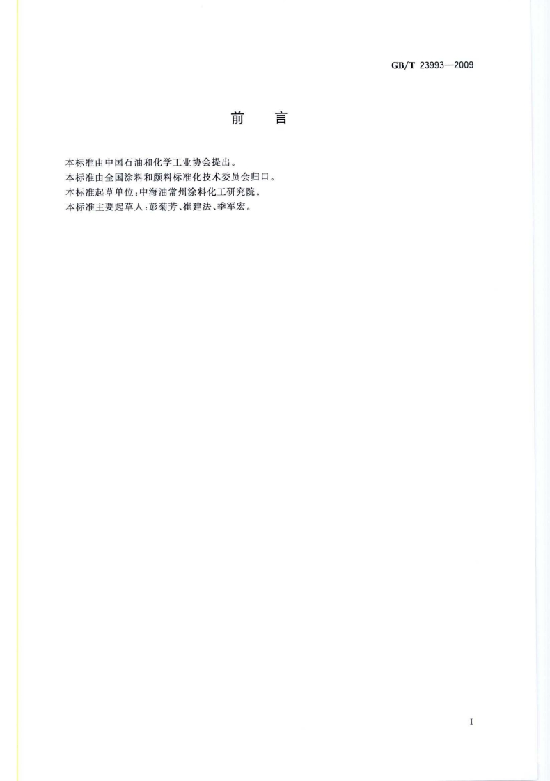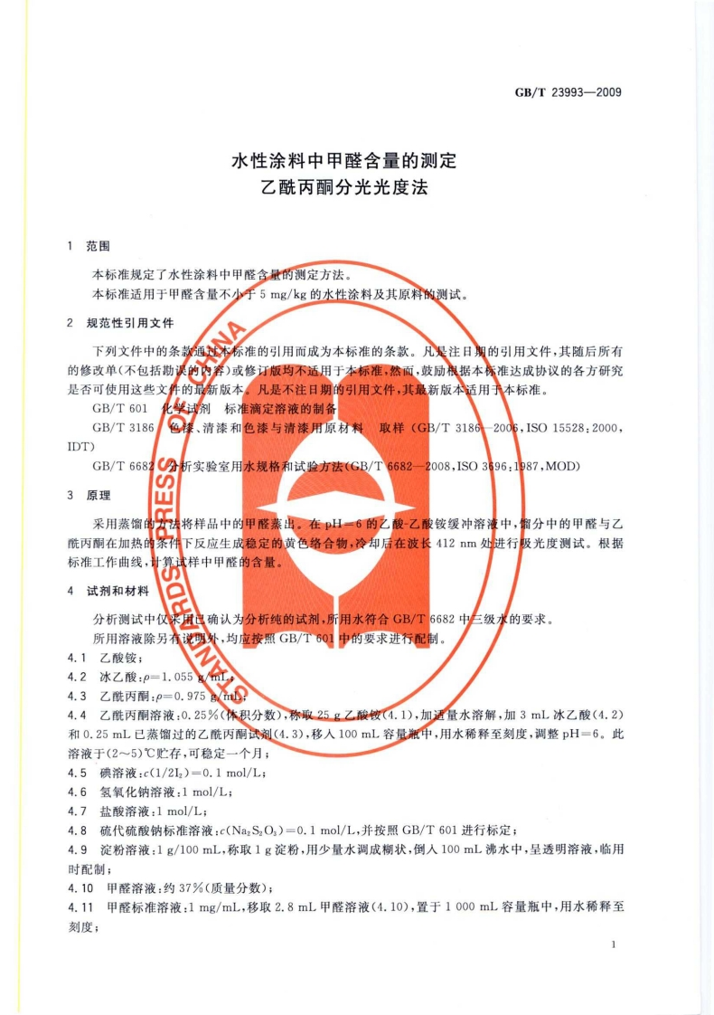 1CS87.040G50GB中华人民共和国国家标准GB/T23993-2009水性涂料中甲醛含量的测定乙酰丙酮分光光度法Determination of formaldehyde content of waterborne coatings-Spectrophtometric method with acetylacetone2009-06-02发布2010-02-01实施中华人民共和国国家质量监督检验检疫总局中国国家标准化管理委员会发布数码防伪