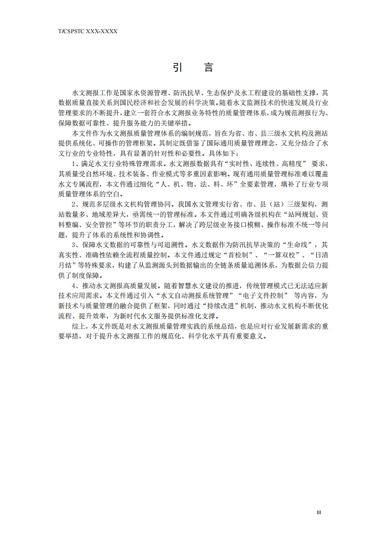 水文测报质量管理体系文件编制规程codeforpreparationofhydrologicalmonitoringandforecastingmanagementsystem348072@abc7天前发布关注私信0.33MB17页026水文测报质量管理体系文件编制规程codeforpreparationofhydrologicalmonitoringandforecastingmanagementsystem此内容为付费资源,请付费后查看¥23¥36黄金会员免费钻石会员免费立即购买您当前未登录!建议登陆后购买,可保存购买订单付费资源 第1页 / 共17页 第2页 / 共17页 第3页 / 共17页 第4页 / 共17页 第5页 / 共17页 试读已结束,还剩12页,您可下载完整版后进行离线阅读 THE END标准规范 文本预览 1CS67.040CCS X18冠T团体标准T/CSPSTC X-2025水文测报质量管理体系文件编制规程code for preparation of hydrological monitoring and forecastingmanagement system(征求意见稿)202X-X-XX发布202X-XX-XX实施中国科技产业化促进会发布中国标准出版社出版 查看更多 收起部分 喜欢就支持一下吧收藏