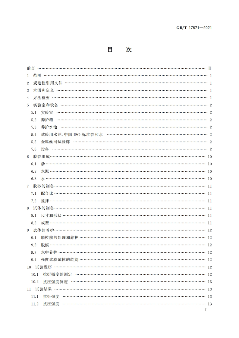 1CS91.100.10CCS Q 11中华人民共和国国家标准GB/T17671-2021代替GB/T17671一1999水泥胶砂强度检验方法(I$0法)Test method of cement mortar strength ISO method(ISO 679:2009,Cement-Test methods-Determination of strength,MOD)2021-12-31发布2022-07-01实施国家市场监督管理总局发布国家标准化管理委员会