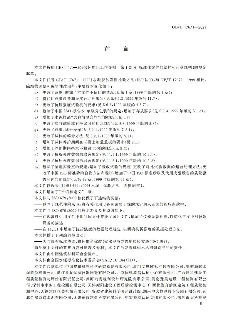 1CS91.100.10CCS Q 11中华人民共和国国家标准GB/T17671-2021代替GB/T17671一1999水泥胶砂强度检验方法(I$0法)Test method of cement mortar strength ISO method(ISO 679:2009,Cement-Test methods-Determination of strength,MOD)2021-12-31发布2022-07-01实施国家市场监督管理总局发布国家标准化管理委员会