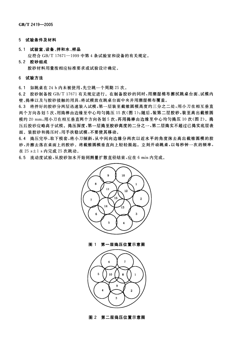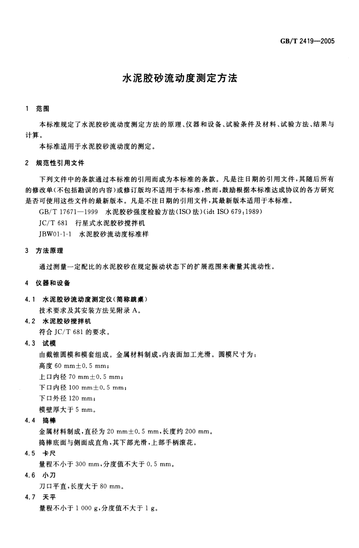水泥胶砂流动度测定方法Testmethodforfluidityofcementmortar348072@abc7天前发布关注私信0.24MB7页026水泥胶砂流动度测定方法Testmethodforfluidityofcementmortar此内容为付费资源,请付费后查看¥23¥36黄金会员免费钻石会员免费立即购买您当前未登录!建议登陆后购买,可保存购买订单付费资源 第1页 / 共7页 第2页 / 共7页 第3页 / 共7页 第4页 / 共7页 第5页 / 共7页 试读已结束,还剩2页,您可下载完整版后进行离线阅读 THE END标准规范 文本预览 ICS91.100.10Q11中华人民共和国国家标准GB/T2419-2005代替GB/T2419一94水泥胶砂流动度测定方法Test method for fluidity of cement mortar2005-01-19发布2005-08-01实施中华人民共和国国家质量监督检验检疫总局中国国家标准化管理委员会发布 查看更多 收起部分 喜欢就支持一下吧收藏