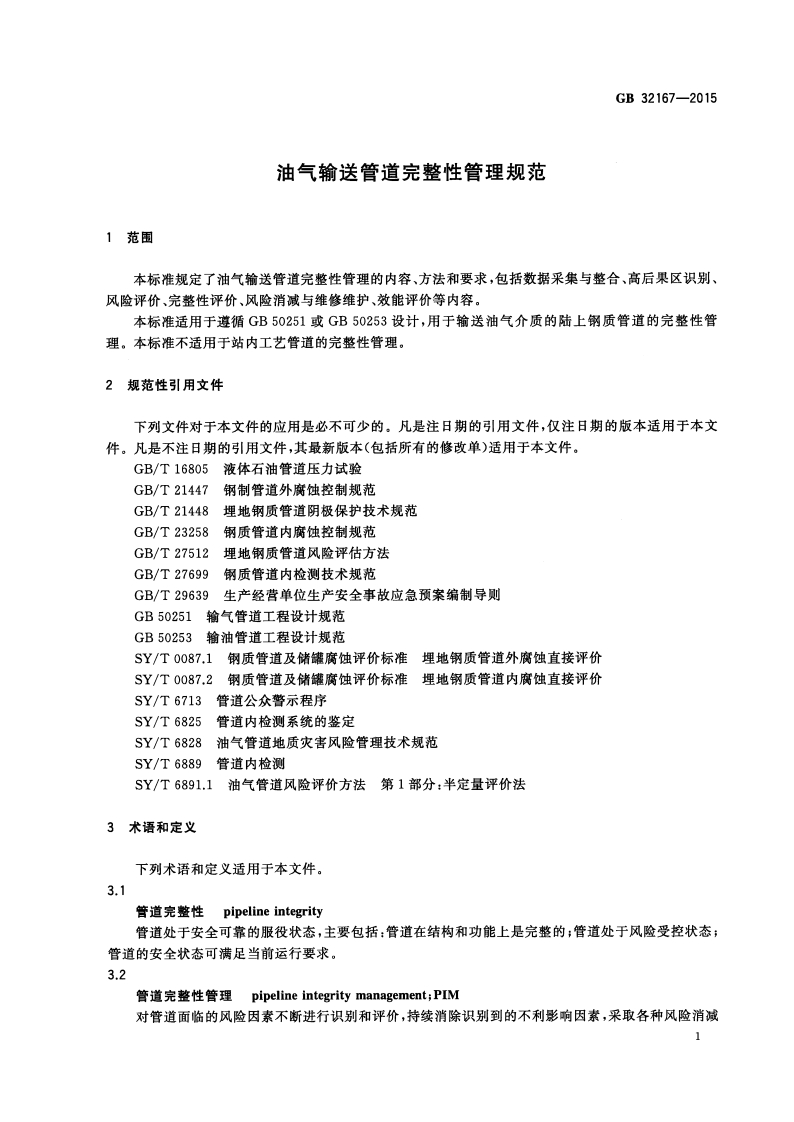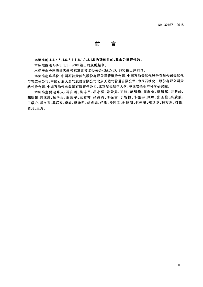 油气输送管道完整性管理规范Oilandgaspipelineintegritymanagementspecification348072@abc7天前发布关注私信4.16MB61页022油气输送管道完整性管理规范Oilandgaspipelineintegritymanagementspecification此内容为付费资源,请付费后查看¥23¥36黄金会员免费钻石会员免费立即购买您当前未登录!建议登陆后购买,可保存购买订单付费资源 第1页 / 共61页 第2页 / 共61页 第3页 / 共61页 第4页 / 共61页 第5页 / 共61页 试读已结束,还剩56页,您可下载完整版后进行离线阅读 THE END标准规范 文本预览 ICs75.200E98GB中华人民共和国国家标准GB32167-2015油气输送管道完整性管理规范Oil and gas pipeline integrity management specification2015-10-13发布2016-03-01实施中华人民共和国国家质量监督检验检疫总局中国国家标准化管理委员会发布 查看更多 收起部分 喜欢就支持一下吧收藏