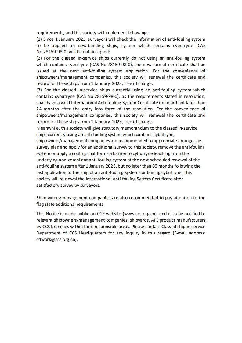 CCSTechnical Information(2022)Technical Information No.6 Total No.578Apr.26,2022(Total 2 pages)To:Shipowners and management companies,Shipyards,AFS product manufacturers,All CCSsurveyorsTechnical Notice on the implementation of Resolutions MEPC.331(76)(Amendments to AFS Convention (Controls on cybutryne andform of the International Anti-fouling System Certificate))The Maritime Environmental Protection Committee of the International MaritimeOrganization,at its 76th session in March 2021,adopted resolutions MEPC.331 (76)---Amendments to the International Convention on the Control of HarmfulAnti-Fouling Systems on Ships.The resolution add the control and surveyrequirements for cybutryne in AFS product system,and amend the format of theForm Of International Anti-fouling System Certificate.It will enter into force on 1January 2023.The main requirements are as followings:1.Since 1 January 2023,all ships shall not apply or re-apply anti-fouling systemscontaining cybutryne;2.Since 1 January 2023,for the ships except:(1)fixed and floating platforms,FSUs,and FPSOs that have been constructed prior to1 January 2023 and that have not been in dry-dock on or after 1 January2023;(2)ships not engaged in international voyages;and(3)ships of less than 400 gross tonnage engaged in international voyages,if acceptedby the coastal State(s),If bearing an anti-fouling system that contains cybutryne in the external coating layerof their hulls or external parts or surfaces,shall either remove the anti-fouling systemor apply a coating that forms a barrier to cybutryne leaching from the underlyingnon-compliant anti-fouling system at the next scheduled renewal of the anti-foulingsystem after 1 January 2023,but no later than 60 months following the lastapplication to the ship of an anti-fouling system containing cybutryne.3.Amend the format of the Form Of International Anti-fouling System Certificate.Shipowners/management companies are kindly recommended to above