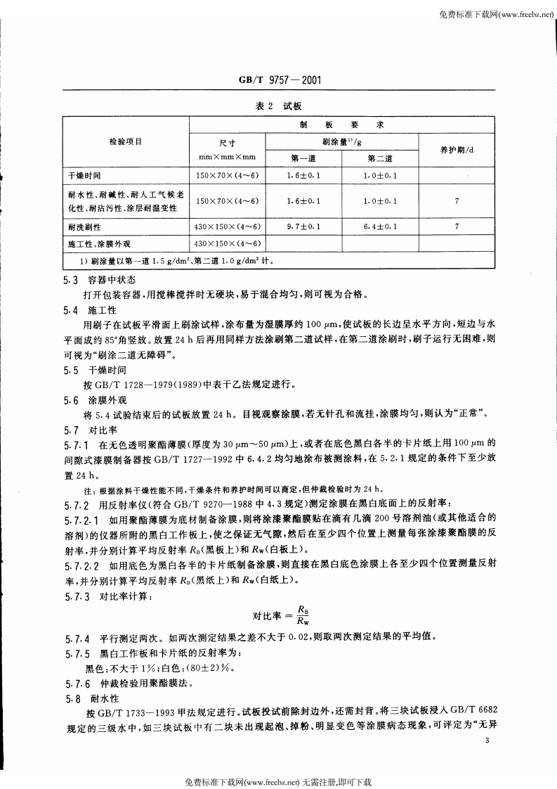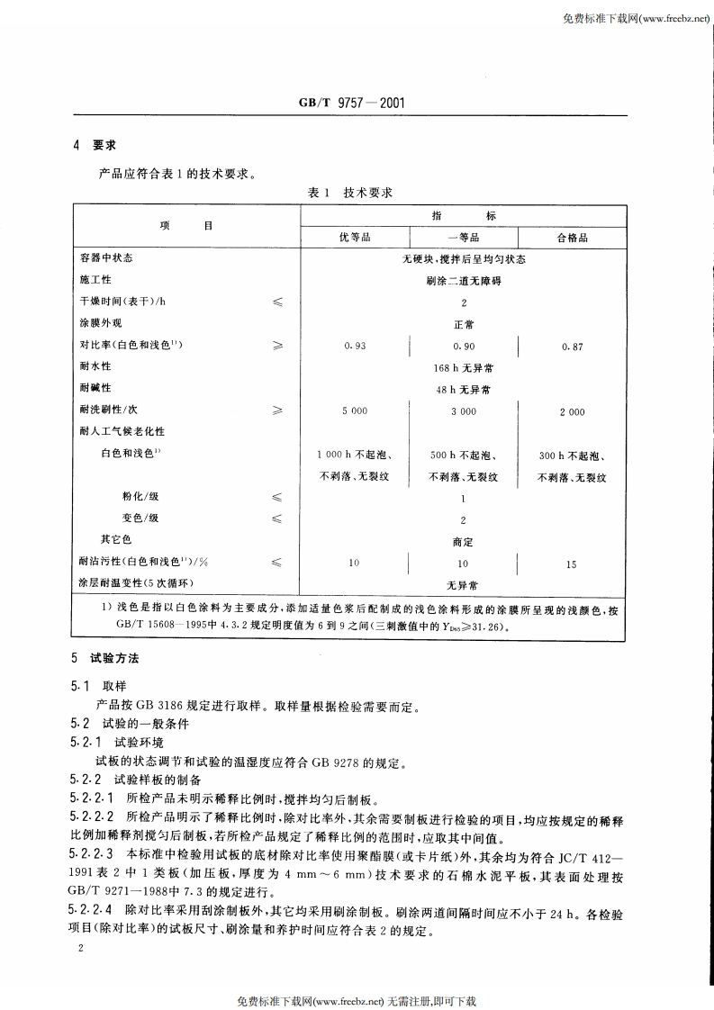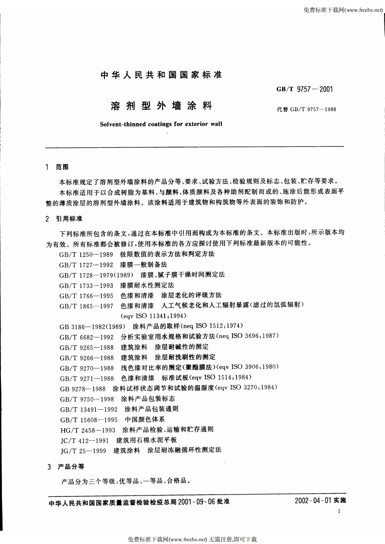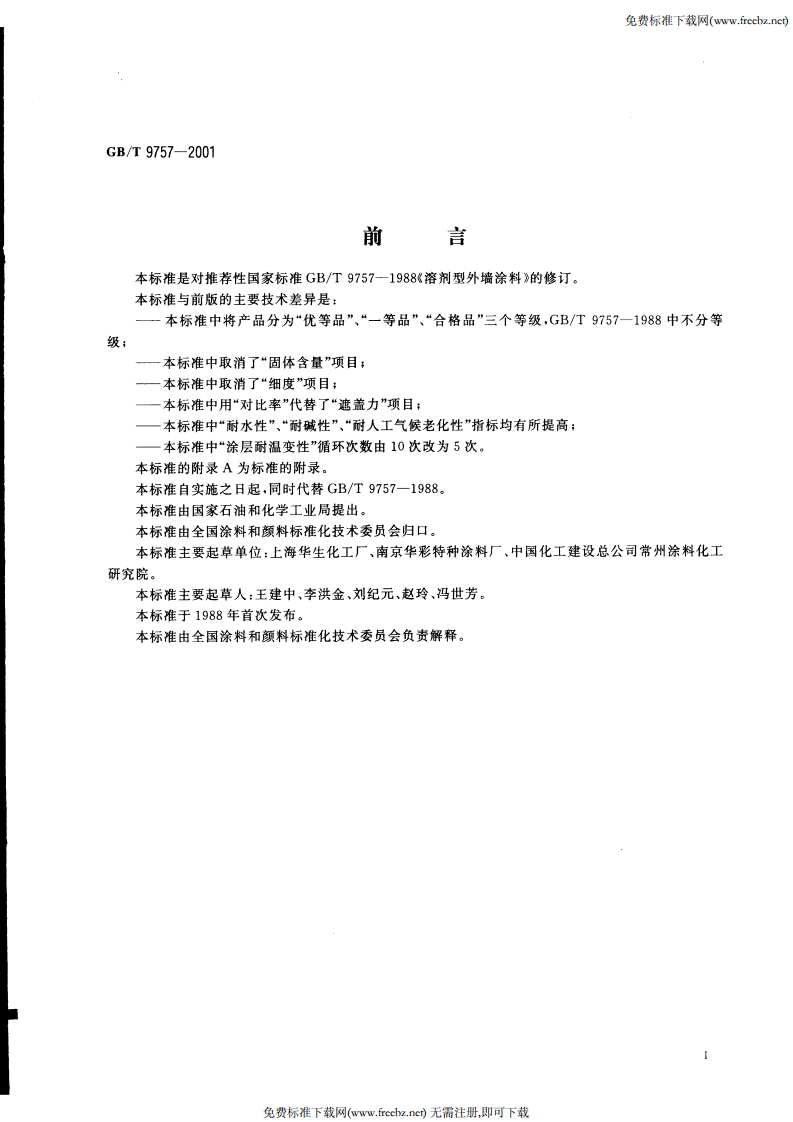 溶剂型外墙涂料Solvent-thinnedcoatingsforexteriorwall348072@abc6天前发布关注私信0.38MB9页038溶剂型外墙涂料Solvent-thinnedcoatingsforexteriorwall此内容为付费资源,请付费后查看¥23¥36黄金会员免费钻石会员免费立即购买您当前未登录!建议登陆后购买,可保存购买订单付费资源 第1页 / 共9页 第2页 / 共9页 第3页 / 共9页 第4页 / 共9页 第5页 / 共9页 试读已结束,还剩4页,您可下载完整版后进行离线阅读 THE END标准规范 文本预览 免费标准下载网(www.frecbz.nc)1Cs87.04020050511G5128-1中华人民共和国国家标准GB/T9757-2001溶剂型外墙涂料Solvent-thinned coatings for exterior wall2001-09-06发布2002-04-01实施中华人民共和国国家质量监督检验检疫总局发布免费标准下载网(www.freebz.nc)无需注册,即可下载 查看更多 收起部分 喜欢就支持一下吧收藏