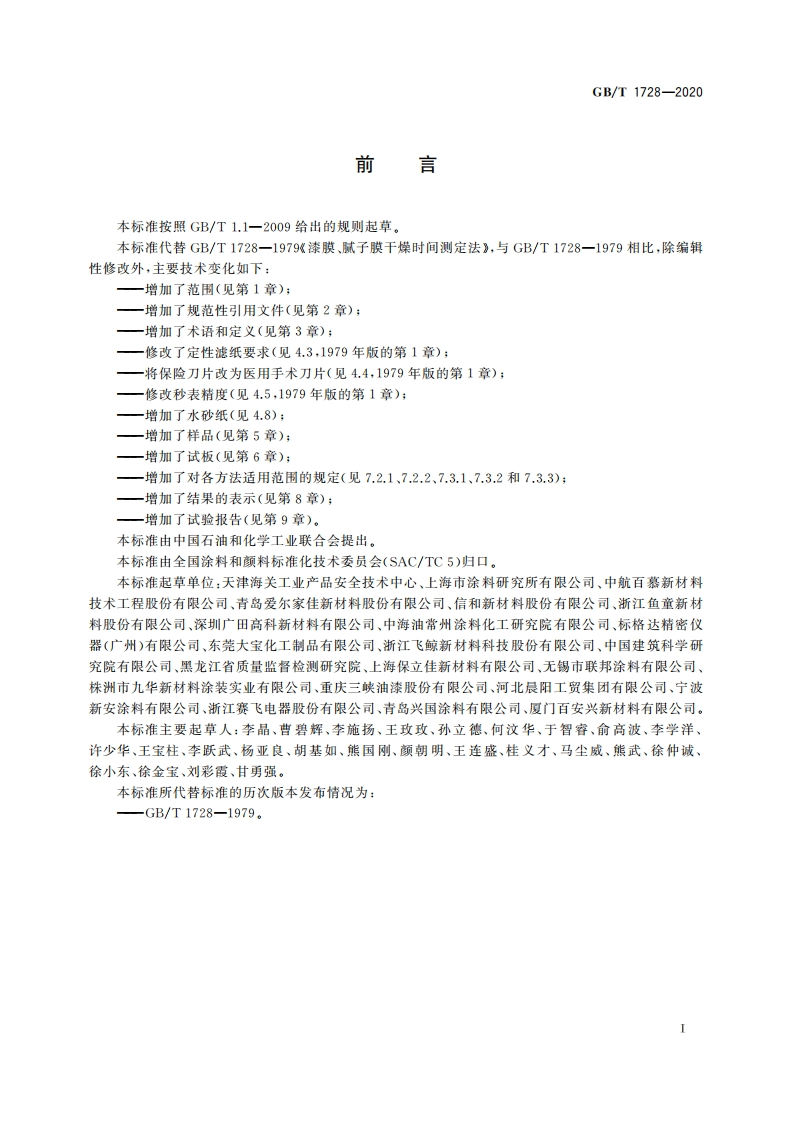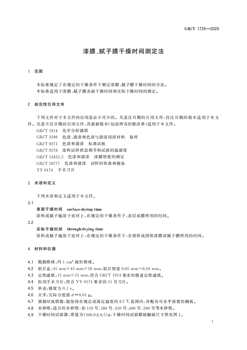 漆膜、腻子膜干燥时间测定法Determinationofdryingtimeofcoatingandputtyfilms348072@abc6天前发布关注私信0.30MB7页030漆膜、腻子膜干燥时间测定法Determinationofdryingtimeofcoatingandputtyfilms此内容为付费资源,请付费后查看¥23¥36黄金会员免费钻石会员免费立即购买您当前未登录!建议登陆后购买,可保存购买订单付费资源 第1页 / 共7页 第2页 / 共7页 第3页 / 共7页 第4页 / 共7页 第5页 / 共7页 试读已结束,还剩2页,您可下载完整版后进行离线阅读 THE END标准规范 文本预览 1CSs87.040G50中华人民共和国国家标准GB/T1728-2020代替GB/T1728一1979漆膜、腻子膜干燥时间测定法Determination of drying time of coating and putty films2020-11-19发布2021-10-01实施国家市场监督管理总局国家标准化管理委员会发布 查看更多 收起部分 喜欢就支持一下吧收藏
