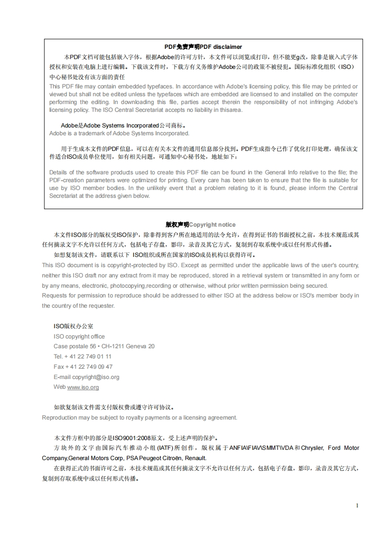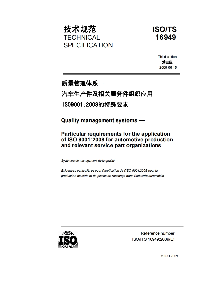 技术规范ISO/TSTECHNICAL16949SPECIFICATIONThird edition第三版2009-06-15质量管理体系一汽车生产件及相关服务件组织应用1S09001:2008的特殊要求Quality management systems-Particular requirements for the applicationof ISO 9001:2008 for automotive productionand relevant service part organizationsSystemes de management de la qualit---Exigences particulieres pour l'application de I'ISO 9001:2008 pour laproduction de serie et de pieces de rechange dans l'industrie automobileReference number1S01TS16949:2009(E)=thkeIS02009