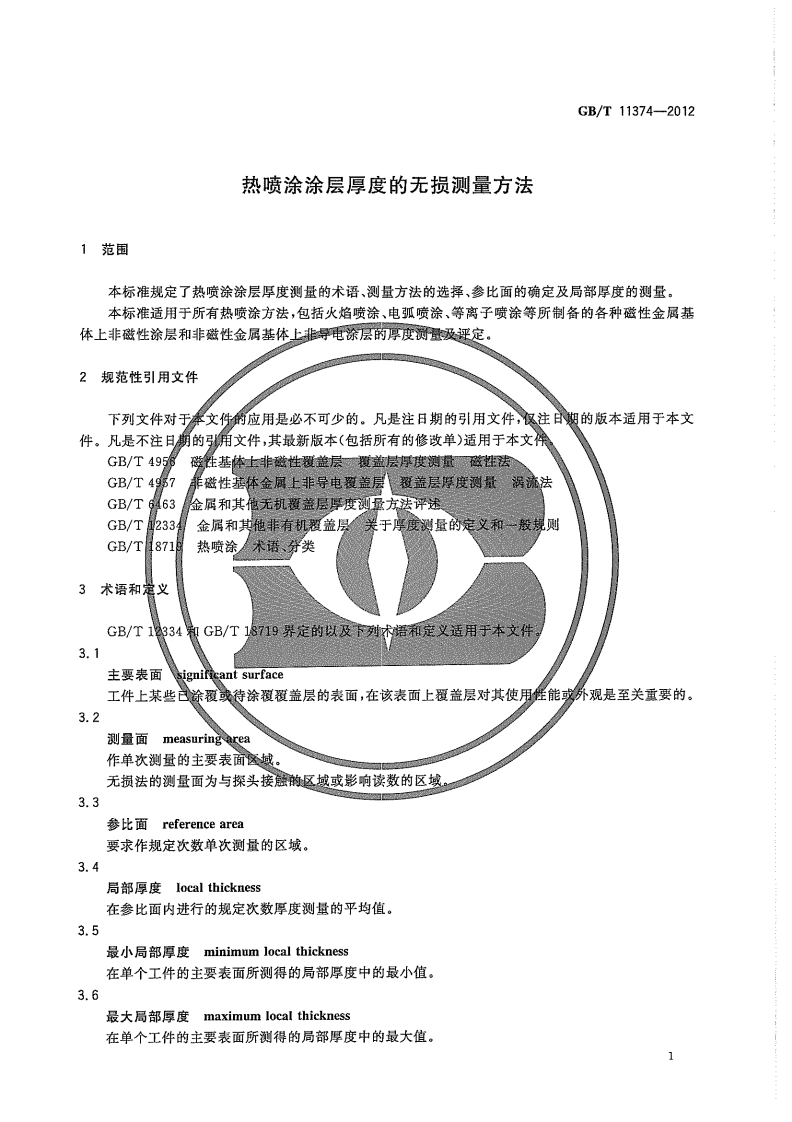 热喷涂涂层厚度的无损测量方法hermalsprayingcoating-Nondestructivemethodsformeasurementofthickness348072@abc5天前发布关注私信0.30MB8页029热喷涂涂层厚度的无损测量方法hermalsprayingcoating-Nondestructivemethodsformeasurementofthickness此内容为付费资源,请付费后查看¥23¥36黄金会员免费钻石会员免费立即购买您当前未登录!建议登陆后购买,可保存购买订单付费资源 第1页 / 共8页 第2页 / 共8页 第3页 / 共8页 第4页 / 共8页 第5页 / 共8页 试读已结束,还剩3页,您可下载完整版后进行离线阅读 THE END标准规范 文本预览 1CS25.220.20A29中华人民共和国国家标准GB/T11374-2012代替GB/T11374-1989热喷涂涂层厚度的无损测量方法Thermal spraying coating-Nondestructive methods for measurement of thickness2012-09-03发布2013-03-01实施中华人民共和国国家质量监督检验检疫总局中国国家标准化管理委员会发布 查看更多 收起部分 喜欢就支持一下吧收藏