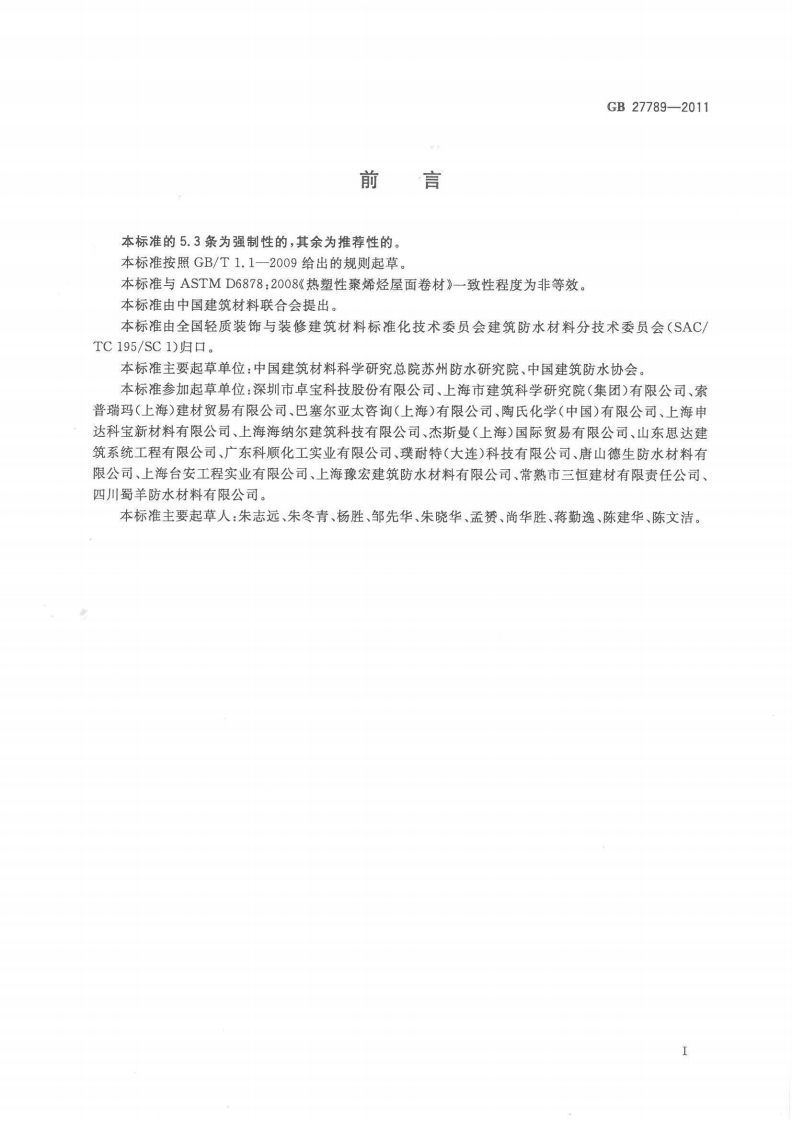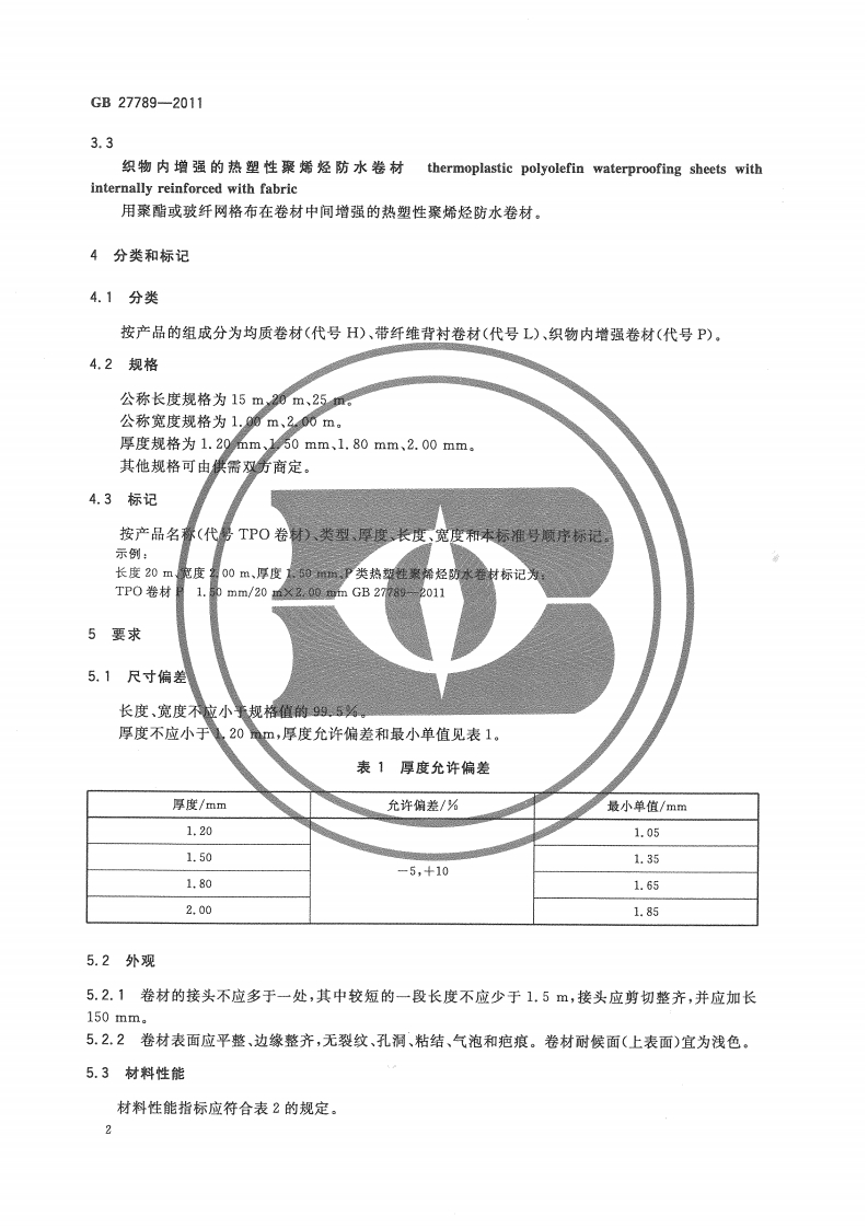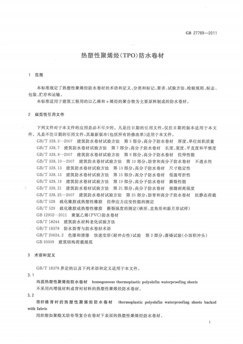 热塑性聚烯烃(TPO)防水卷材Thermoplasticpolyolefinsheetsforwaterproofing348072@abc5天前发布关注私信2.15MB13页048热塑性聚烯烃(TPO)防水卷材Thermoplasticpolyolefinsheetsforwaterproofing此内容为付费资源,请付费后查看¥23¥36黄金会员免费钻石会员免费立即购买您当前未登录!建议登陆后购买,可保存购买订单付费资源 第1页 / 共13页 第2页 / 共13页 第3页 / 共13页 第4页 / 共13页 第5页 / 共13页 试读已结束,还剩8页,您可下载完整版后进行离线阅读 THE END标准规范 文本预览 ICS91.120.30017中华人民共和国国家标准GB27789-2011热塑性聚烯烃(TPO)防水卷材Thermoplastic polyolefin sheets for waterproofing2011-12-30发布2012-11-01实施中华人民共和国国家质量监督检验检疫总局中国国家标准化管理委员会发布数码防奶 查看更多 收起部分 喜欢就支持一下吧收藏
