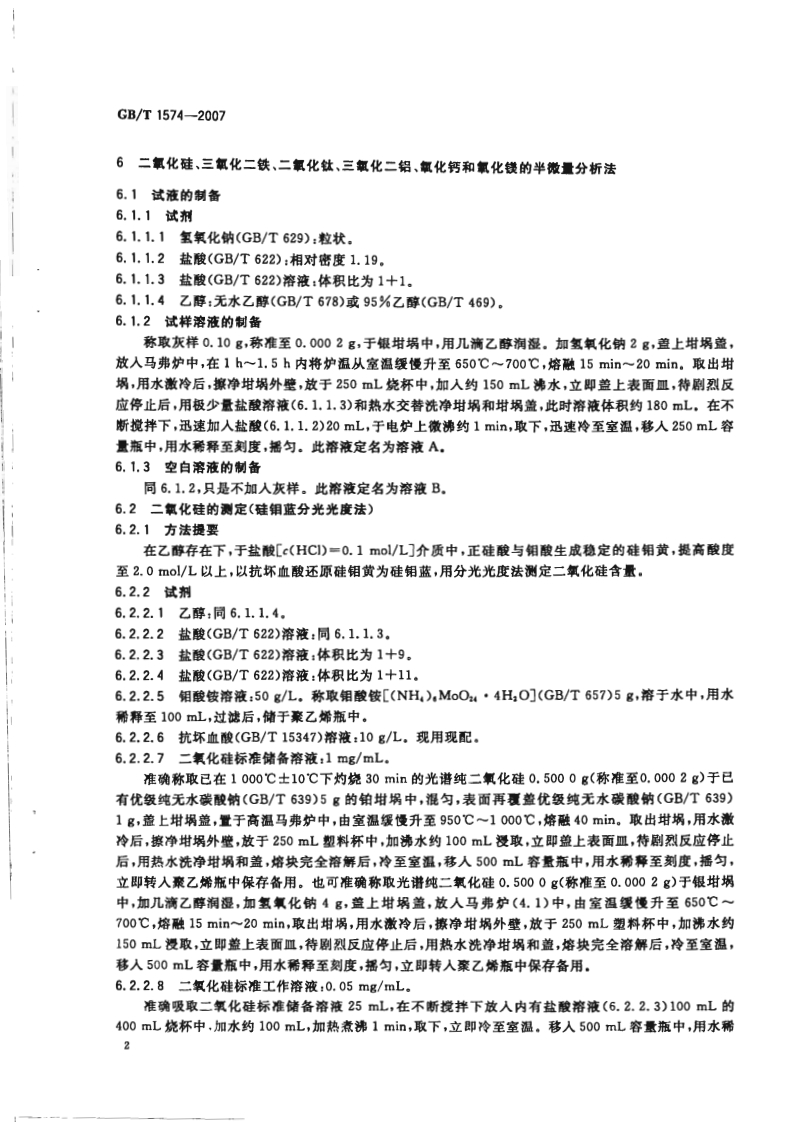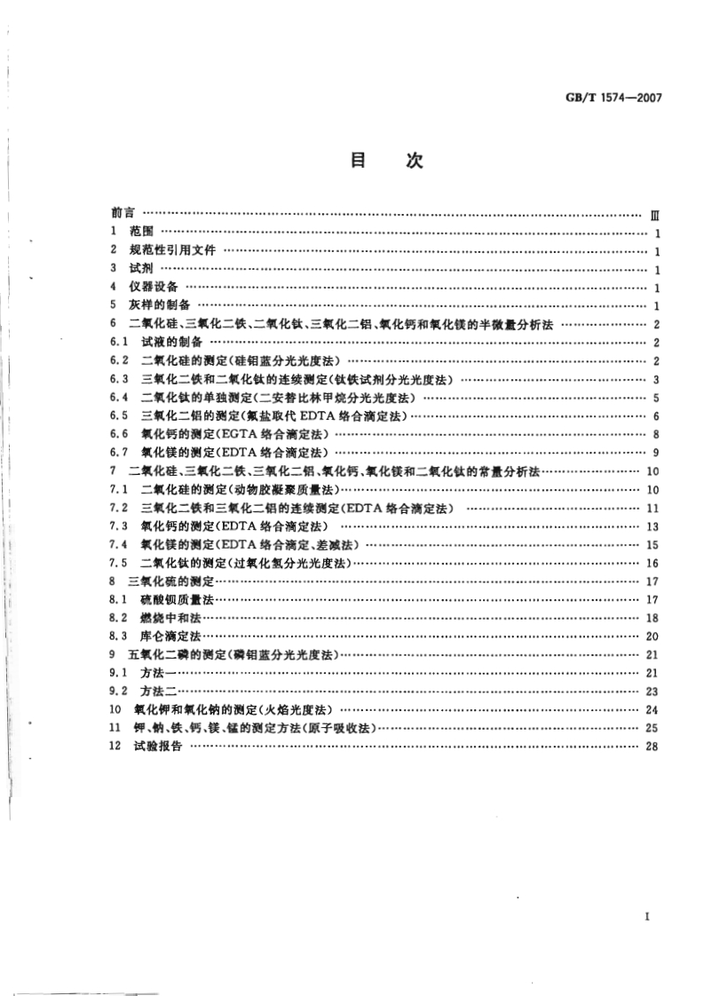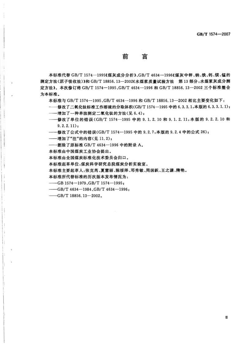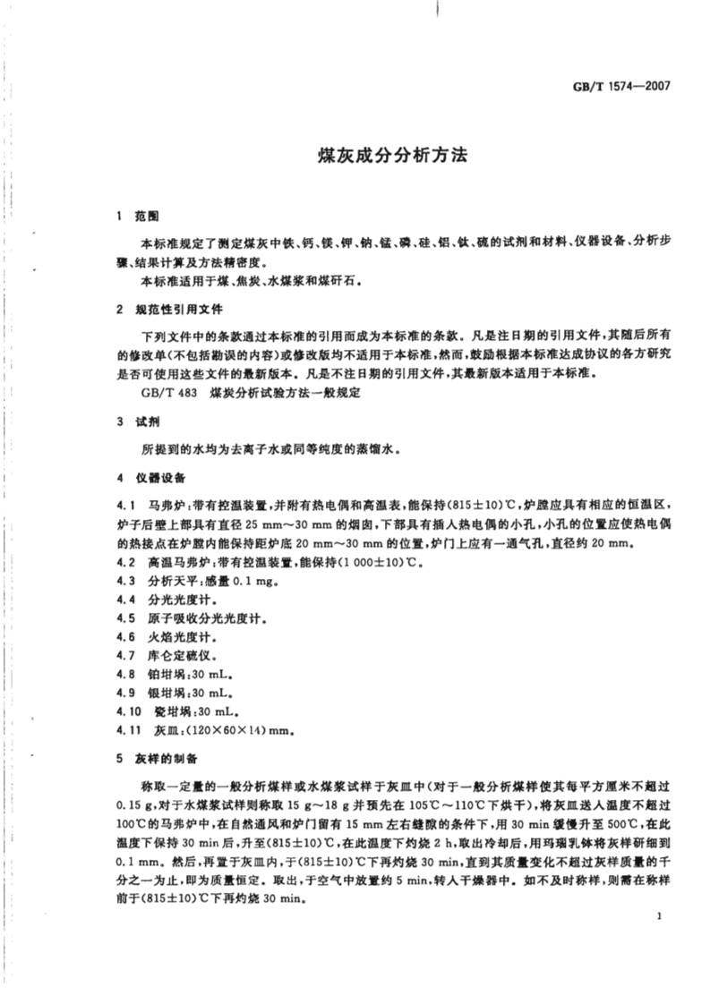 1Cs73.040D21中华人民共和国国家标准GB/T1574-2007代替GB/T1574-1995,GB/T4634-1996,GB/T18856.13一2002煤灰成分分析方法Test method for analysis of coal ash2007-11-01发布2008-06-01实施中华人民共和国国家质量监督检验检疫总局中国国家标准化管理委员会发布