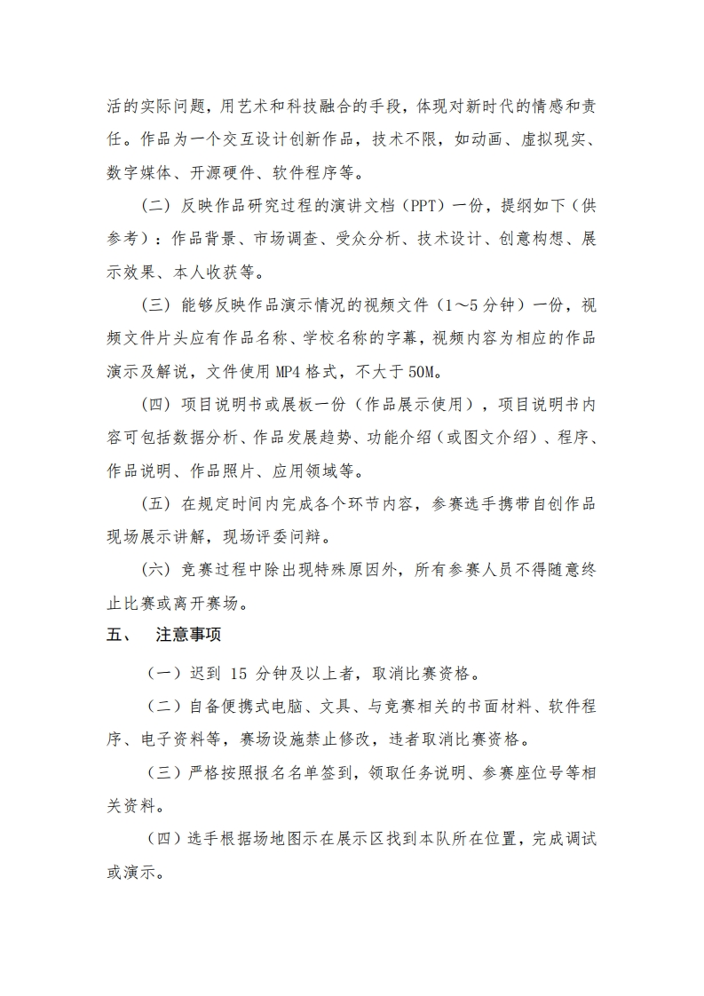 2021-2022全国青少年电子信息智能创新大赛复赛规则一电子艺术挑战赛(高中组)比赛形式每组2人,组队参加,完成作品展示、作品讲解、问辩任务。二、比赛内容(一)展示环节1.参赛选手携带用途新颖、功能显著或具有艺术性的作品在指定区域展示和讲解说明。2.讲解内容可以包括自己撰写作品说明、自己制作作品演示视频、自己设计作品结构或程序等。(二)答辩环节1.每个作品参与者2人,学生讲解时间不超过5分钟。2.参赛选手通过作品pt、作品说明文档、作品演示视频等阐述并讲解作品功能、设计思路、制作过程、未来前景等内容,回答评委问题。三、比赛器材电子艺术创新作品所需材料或文件,全部由个人根据作品自行准备。自备便携式电脑和文具。四、比赛要求(一)参赛作品需要围绕一个影响社会发展、行业进步、人本生
