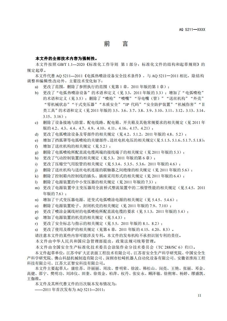 电弧热喷涂设备安全技术条件Safetytechnicalconditionforarcthermalsprayingequipment(征求意见稿348072@abc3天前发布关注私信0.58MB33页021电弧热喷涂设备安全技术条件Safetytechnicalconditionforarcthermalsprayingequipment(征求意见稿此内容为付费资源,请付费后查看¥23¥36黄金会员免费钻石会员免费立即购买您当前未登录!建议登陆后购买,可保存购买订单付费资源 第1页 / 共33页 第2页 / 共33页 第3页 / 共33页 第4页 / 共33页 第5页 / 共33页 试读已结束,还剩28页,您可下载完整版后进行离线阅读 THE END标准规范 文本预览 ICS13.100CCS C 68AQ中华人民共和国安全生产行业标准AQ5211-20XX代替A05211-2011电弧热喷涂设备安全技术条件Safety technical condition for arc thermal spraying equipment(征求意见稿)××××-××-××发布X×××-×X-××实施中华人民共和国应急管理部发布 查看更多 收起部分 喜欢就支持一下吧收藏