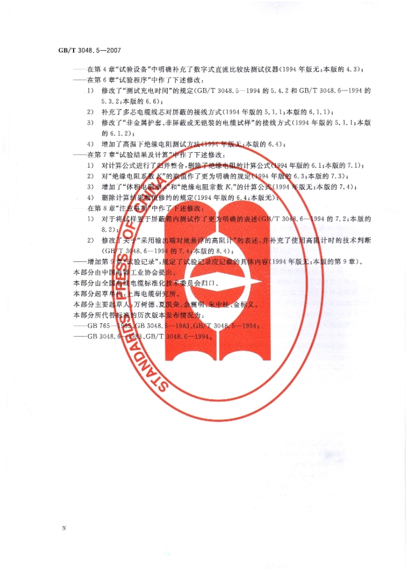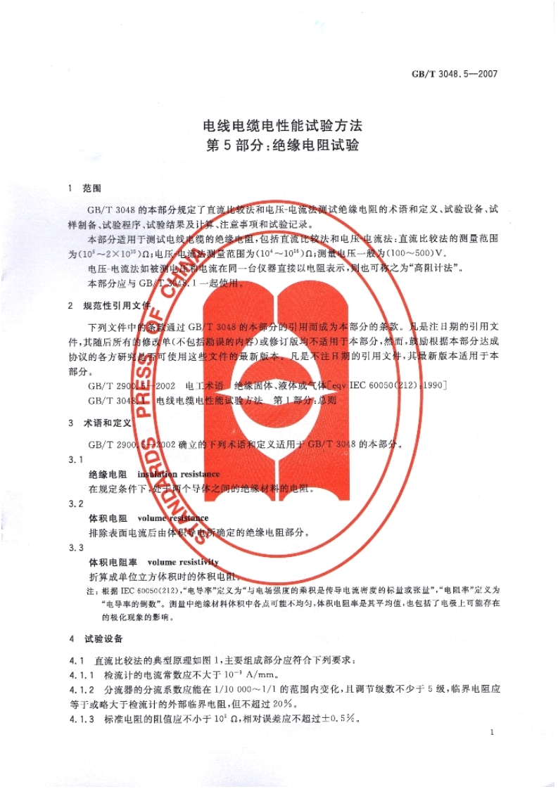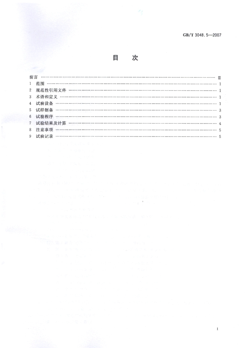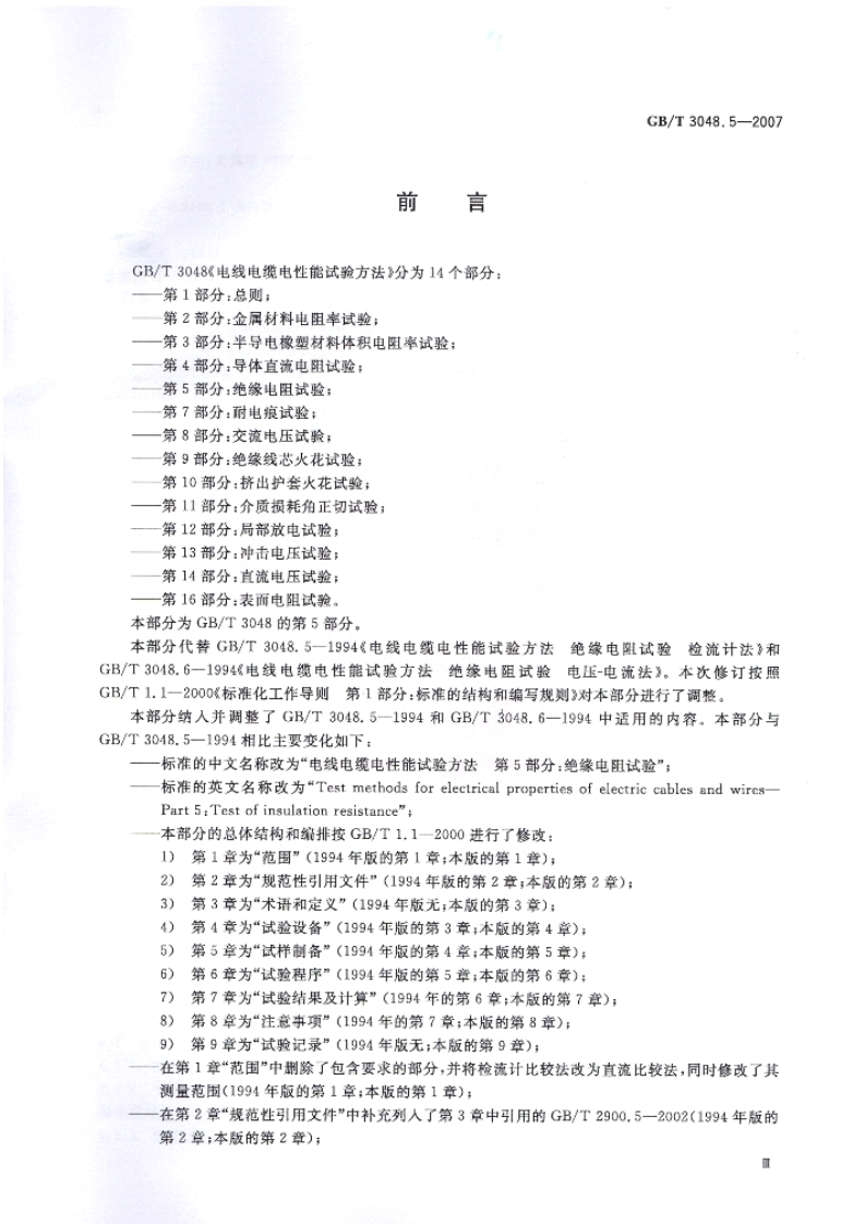 1CS29.060.20K13中华人民共和国国家标准GB/T3048.5-2007代GB/T3048.5-1994,GB/T3048.6-1994电线电缆电性能试验方法第5部分:绝缘电阻试验Test methods for electrical properties of electric cables and wires-Part 5:Test of insulation resistance2007-12-03发布2008-05-01实施中华人民共和国国家质量监督检验检疫总局中国国家标准化管理委员会发布