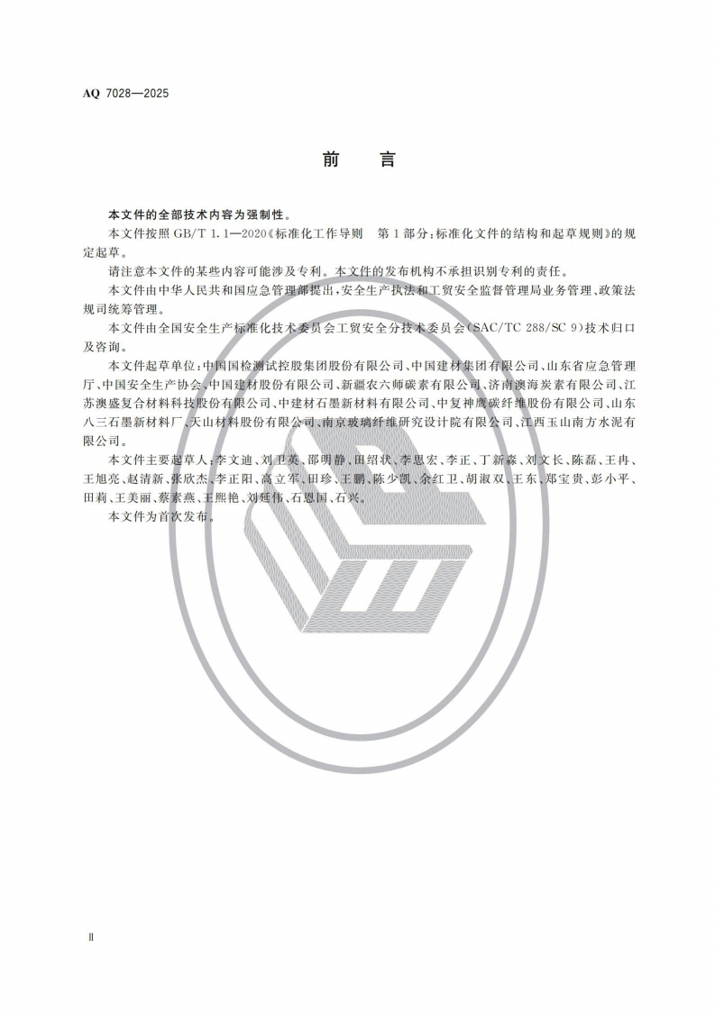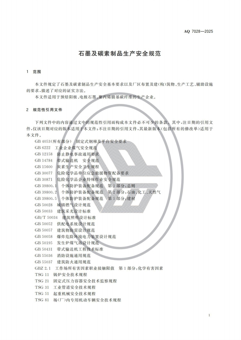 石墨及碳素制品生产安全规范Safetyspecificationforcarbonmaterialandgraphiteproduction348072@abc3天前发布关注私信4.43MB15页048石墨及碳素制品生产安全规范Safetyspecificationforcarbonmaterialandgraphiteproduction此内容为付费资源,请付费后查看¥23¥36黄金会员免费钻石会员免费立即购买您当前未登录!建议登陆后购买,可保存购买订单付费资源 第1页 / 共15页 第2页 / 共15页 第3页 / 共15页 第4页 / 共15页 第5页 / 共15页 试读已结束,还剩10页,您可下载完整版后进行离线阅读 THE END标准规范 文本预览 1CS13.100CCS C 65AQ中华人民共和国安全生产行业标准AQ7028-2025石墨及碳素制品生产安全规范Safety specification for carbon material and graphite production2025-11-14发布2026-06-01实施中华人民共和国应急管理部发布 查看更多 收起部分 喜欢就支持一下吧收藏
