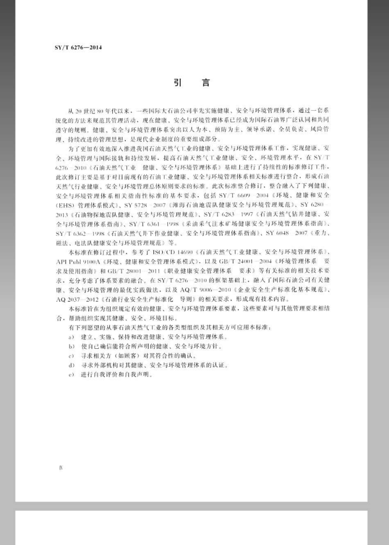 E09备案号:48192-2015SY中华人民共和国石油天然气行业标准SY/T6276-2014代替SY/T(7%3.SY/T(53-3i.SY/T5)-3,SY/T(4w-34.SY572s-37.SY(N)-313.SY/T 666-3012.SY/T 6630-3012.SY/T 623-197.SY/T 6361-19.SY/T 6%62-198.SY (8-31石油天然气工业健康、安全与环境管理体系Petroleum and natural gas industrieshealth,safety and environmental management systems2014-10-15发布2015一03一01实施国家能源局发布