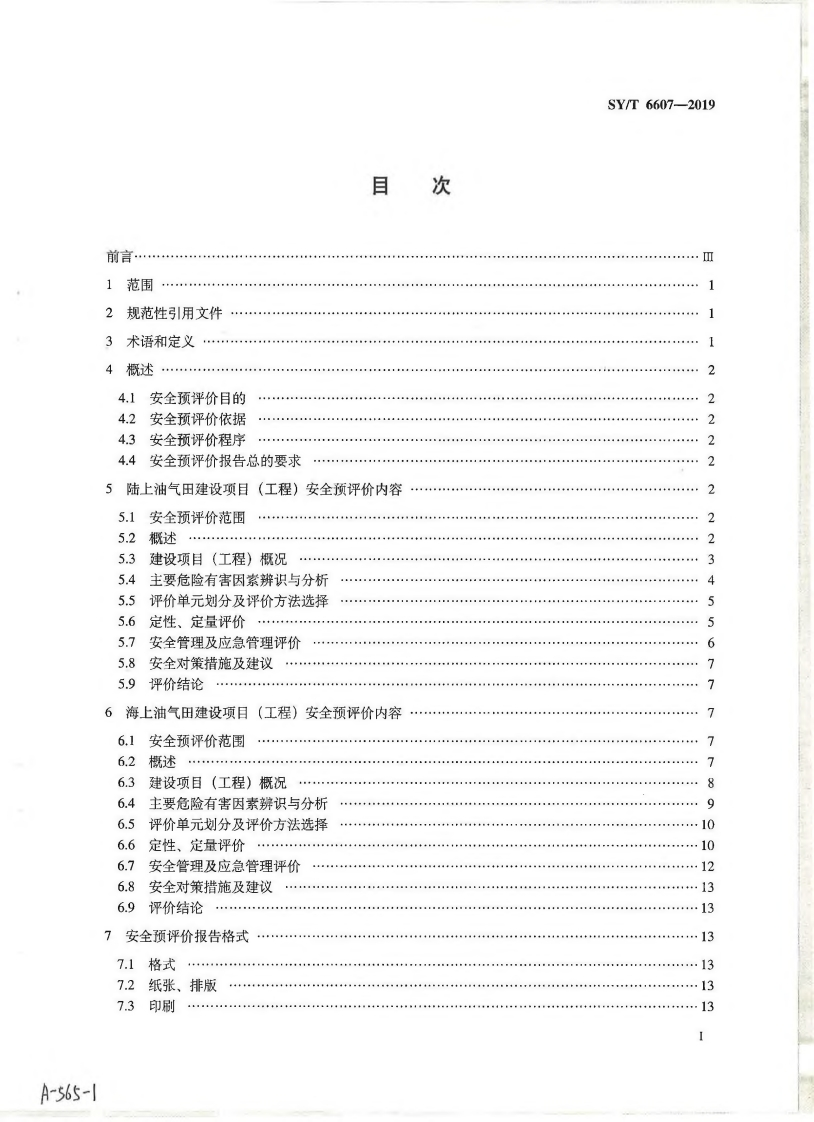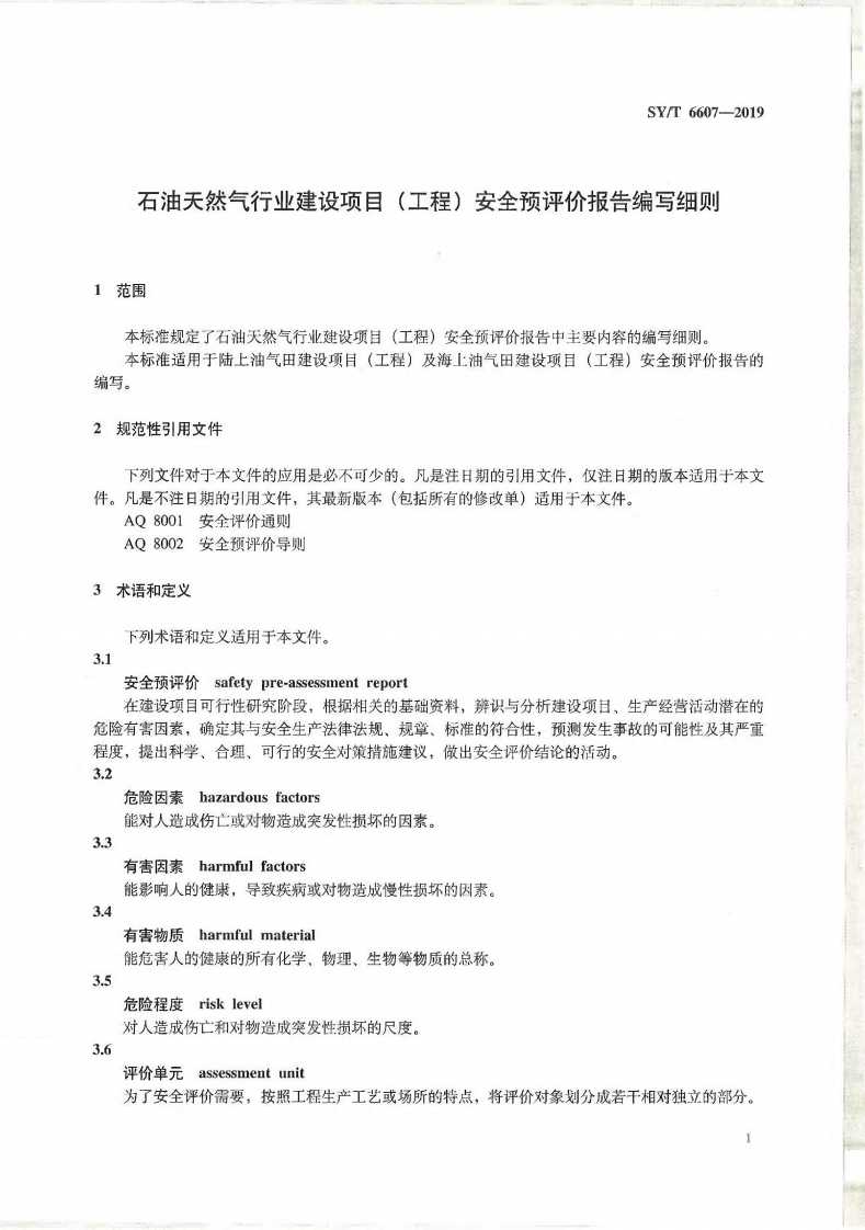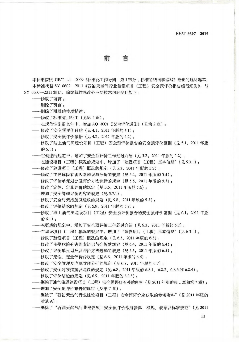 ICS13.100E09SY受控中华人民共和国石油天然气行业标准SY/T6607-2019代替SY6607-2011石油天然气行业建设项目(工程)安全预评价报告编写细则Detail compiling rules on safety pre-assessment reportfor oil and gas industry projects (engineering)2019-11一04发布2020-05-01实施国家能源局发布