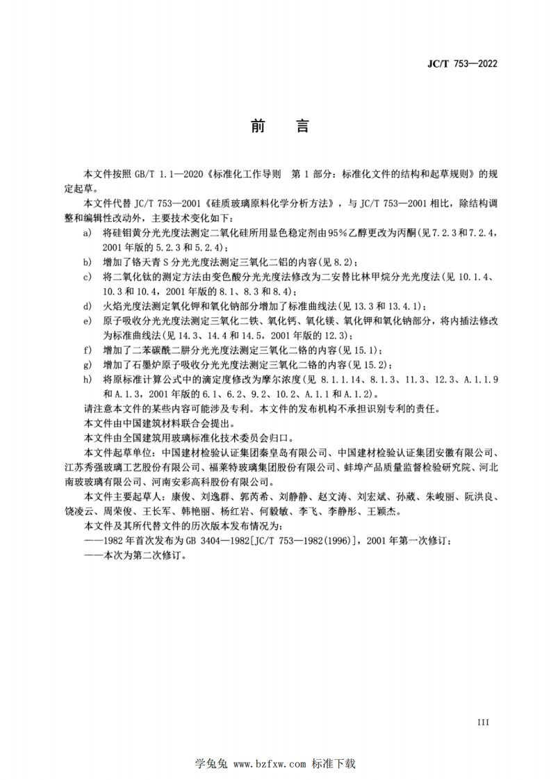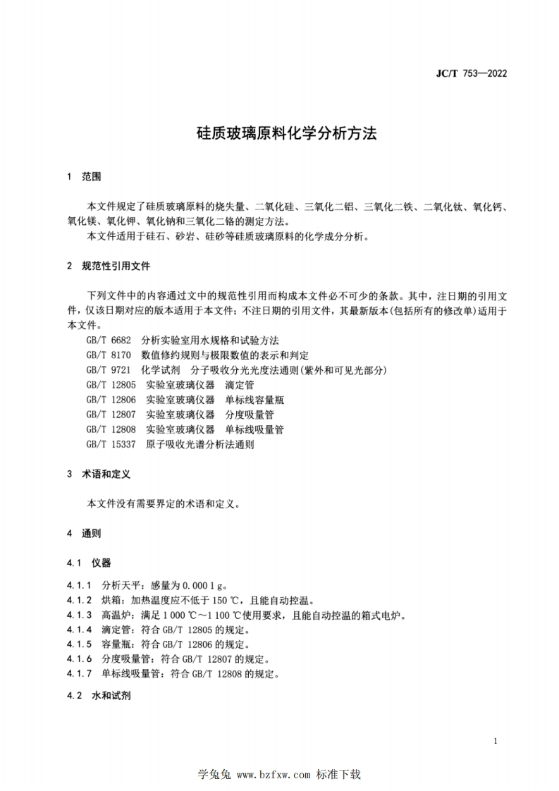 硅质玻璃原料化学分析方法Methodsforchemicalanalysisofglass-makingsand_硅质玻璃原料化学分析方法Methodsforchemicalanalysisofglassmakingsand348072@abc3天前发布关注私信8.71MB25页040硅质玻璃原料化学分析方法Methodsforchemicalanalysisofglass-makingsand_硅质玻璃原料化学分析方法Methodsforchemicalanalysisofglassmakingsand此内容为付费资源,请付费后查看¥23¥36黄金会员免费钻石会员免费立即购买您当前未登录!建议登陆后购买,可保存购买订单付费资源 第1页 / 共25页 第2页 / 共25页 第3页 / 共25页 第4页 / 共25页 第5页 / 共25页 试读已结束,还剩20页,您可下载完整版后进行离线阅读 THE END标准规范 文本预览 ICS81.040CCS Q 34JC中华人民共和国建材行业标准JC/T753一2022代替JC/T753-2001硅质玻璃原料化学分析方法Methods for chemical analysis of glass-making sand2022-09-30发布2023-04-01实施中华人民共和国工业和信息化部发布学兔免www.bzfxw.com标准下载 查看更多 收起部分 喜欢就支持一下吧收藏