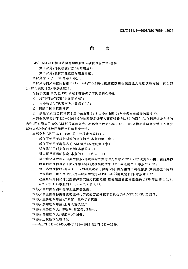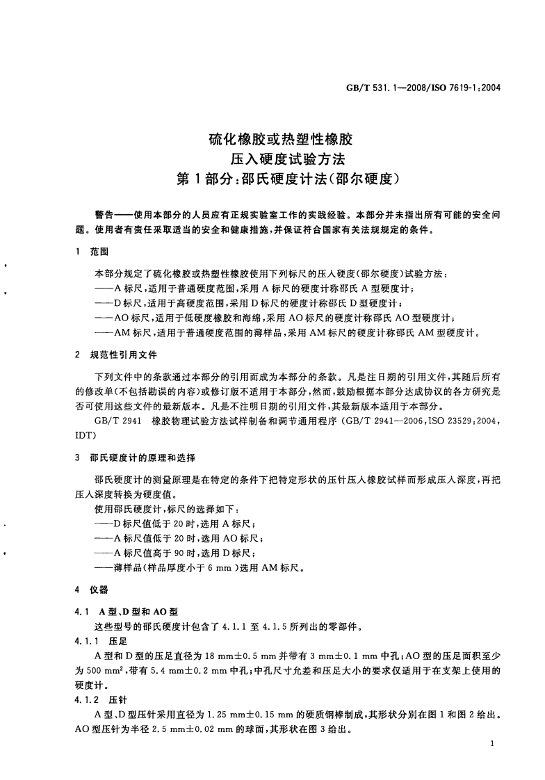 ICs83.060G40G中华人民共和国国家标准GB/T531.1-2008/1S07619-1:2004部分代替GB/T531-1999硫化橡胶或热塑性橡胶压入硬度试验方法第1部分:邵氏硬度计法(邵尔硬度)Rubber,vulcanized or thermoplastic-Determination of indentation hardness-Part 1:Duromerer method(Shore hardness)(IS07619-1:2004,IDT)2008-06-04发布2008-12-01实施中华人民共和国国家质量监督检验检疫总局数码防/中国国家标准化管理委员会发布