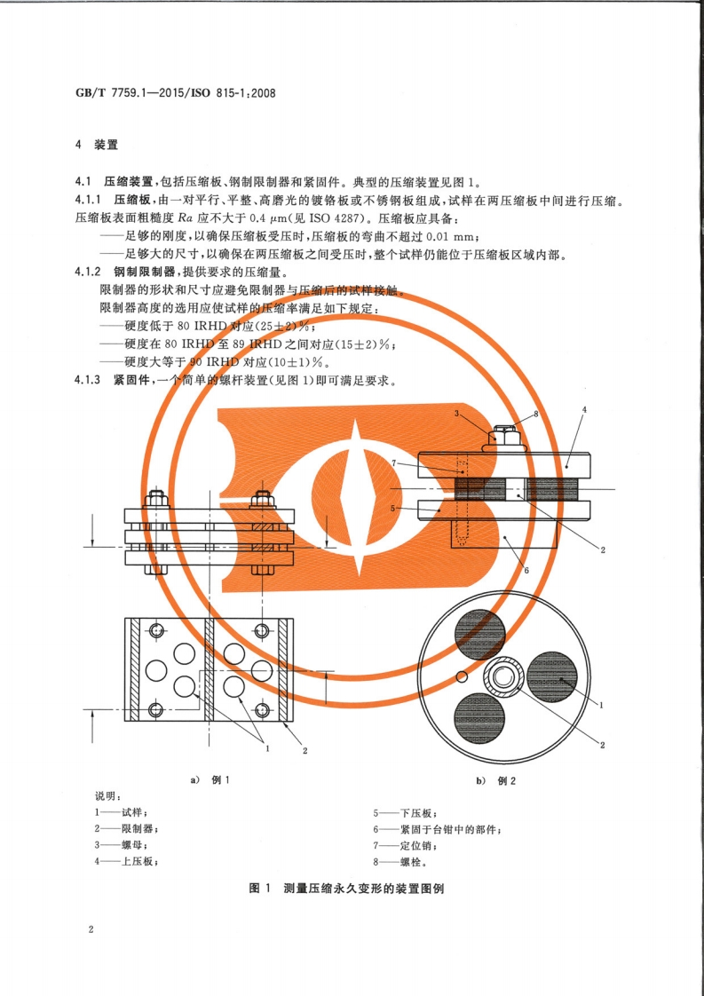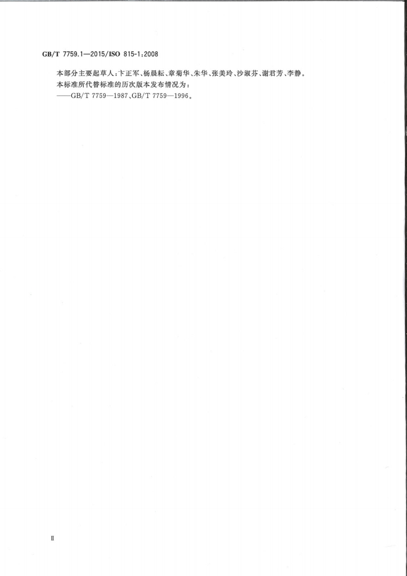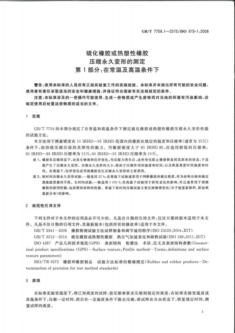 1CS83.060G40中华人民共和国国家标准GB/T7759.1-2015/1S0815-1:2008代替GB/T7759一1996硫化橡胶或热塑性橡胶压缩永久变形的测定第1部分:在常温及高温条件下Rubber,vulcanized or thermoplastic-Determination of compression set-Part 1:At ambient or elevated temperatures(IS0815-1:2008,IDT)2015-05-15发布2015-10-01实施中华人民共和国国家质量监督检验检疫总局中国国家标准化管理委员会发布