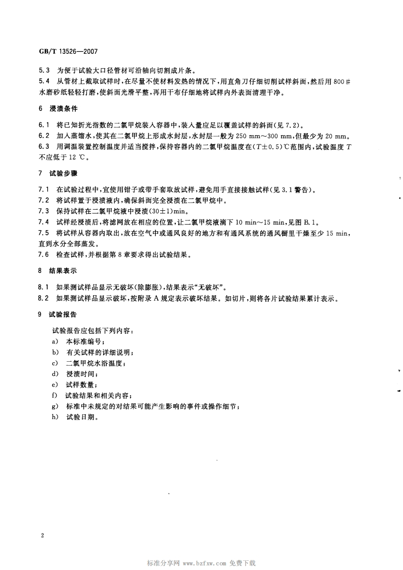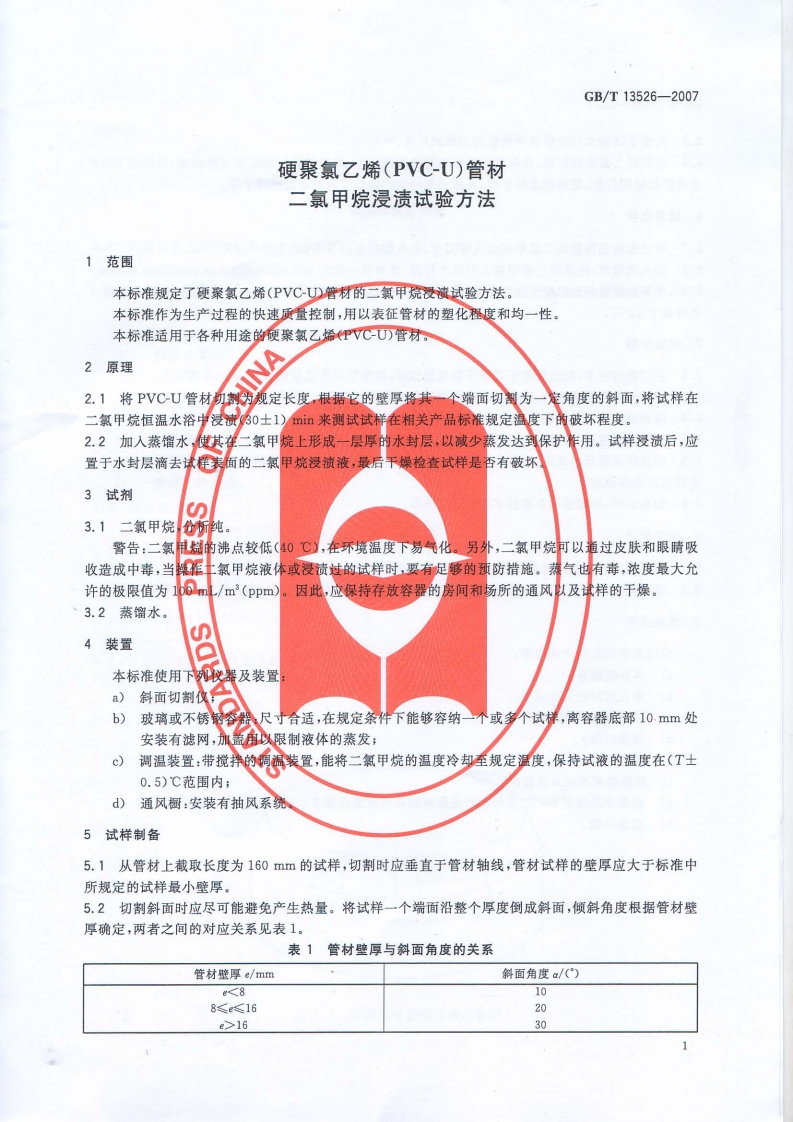 ICS83.140.30G33中华人民共和国国家标准GB/T13526-2007代替GB/T13526一1992硬聚氯乙烯(PVCU)管材二氯甲烷浸渍试验方法Unplasticized polyvinyl chloride(PVC-U)pipes-Dichloromethane resistance test method2007-12-05发布2008-09-01实施中华人民共和国国家质量监督检验检疫总局中国国家标准化管理委员会发布