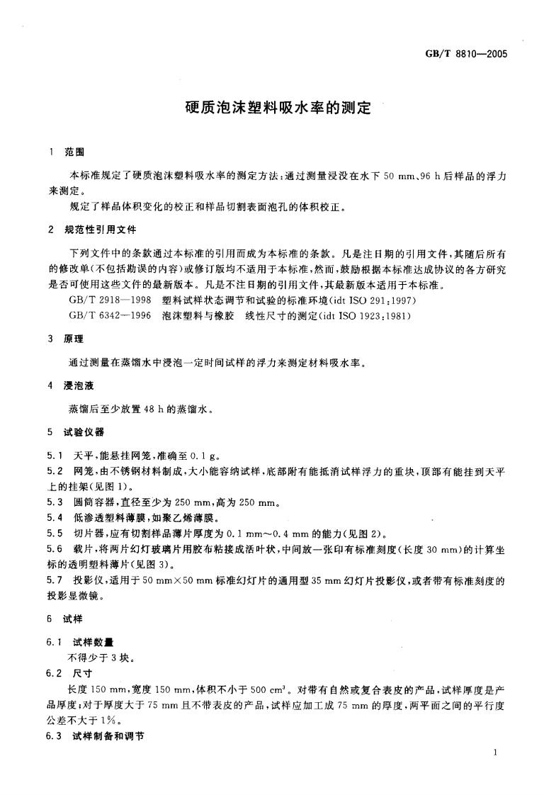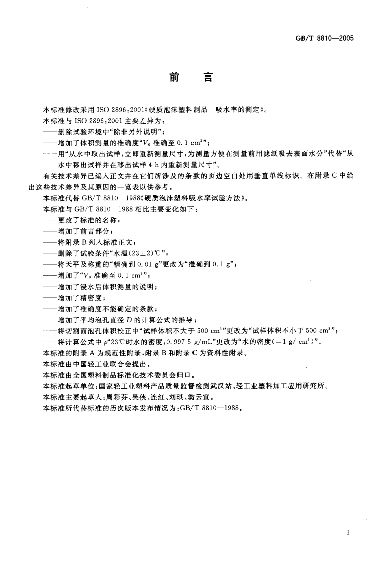 1CS83.100G32中华人民共和国国家标准GB/T8810一2005代替GB/T8810一1988硬质泡沫塑料吸水率的测定Determination of water absorption ofrigid cellular plastics(ISO 2896:2001,Rigid cellular plastics-Determination of waterabsorption,MOD)2005-11-17发布2006-05-01实施中华人民共和国国家质量监督检验检疫总局中国国家标准化管理委员会发布